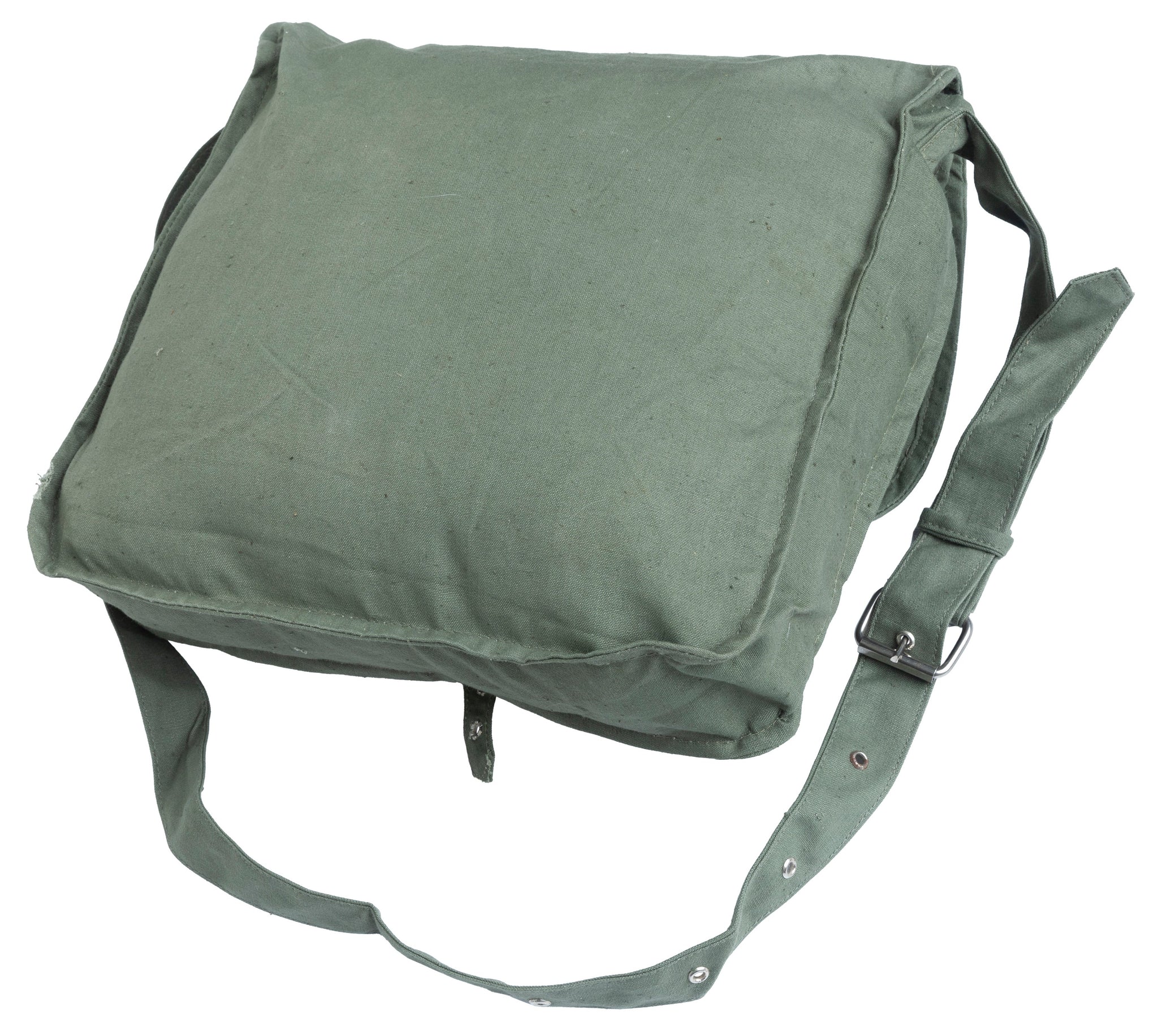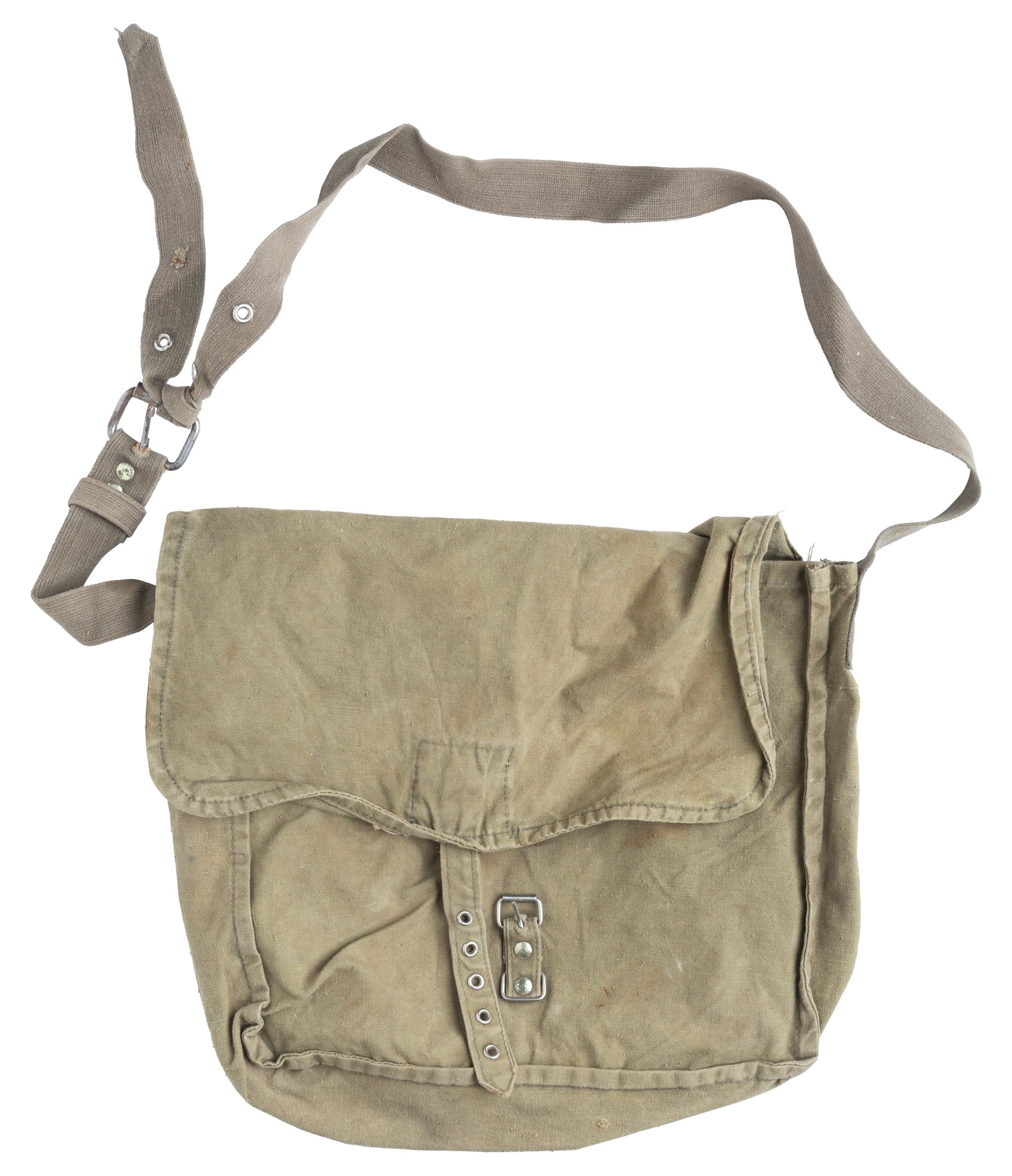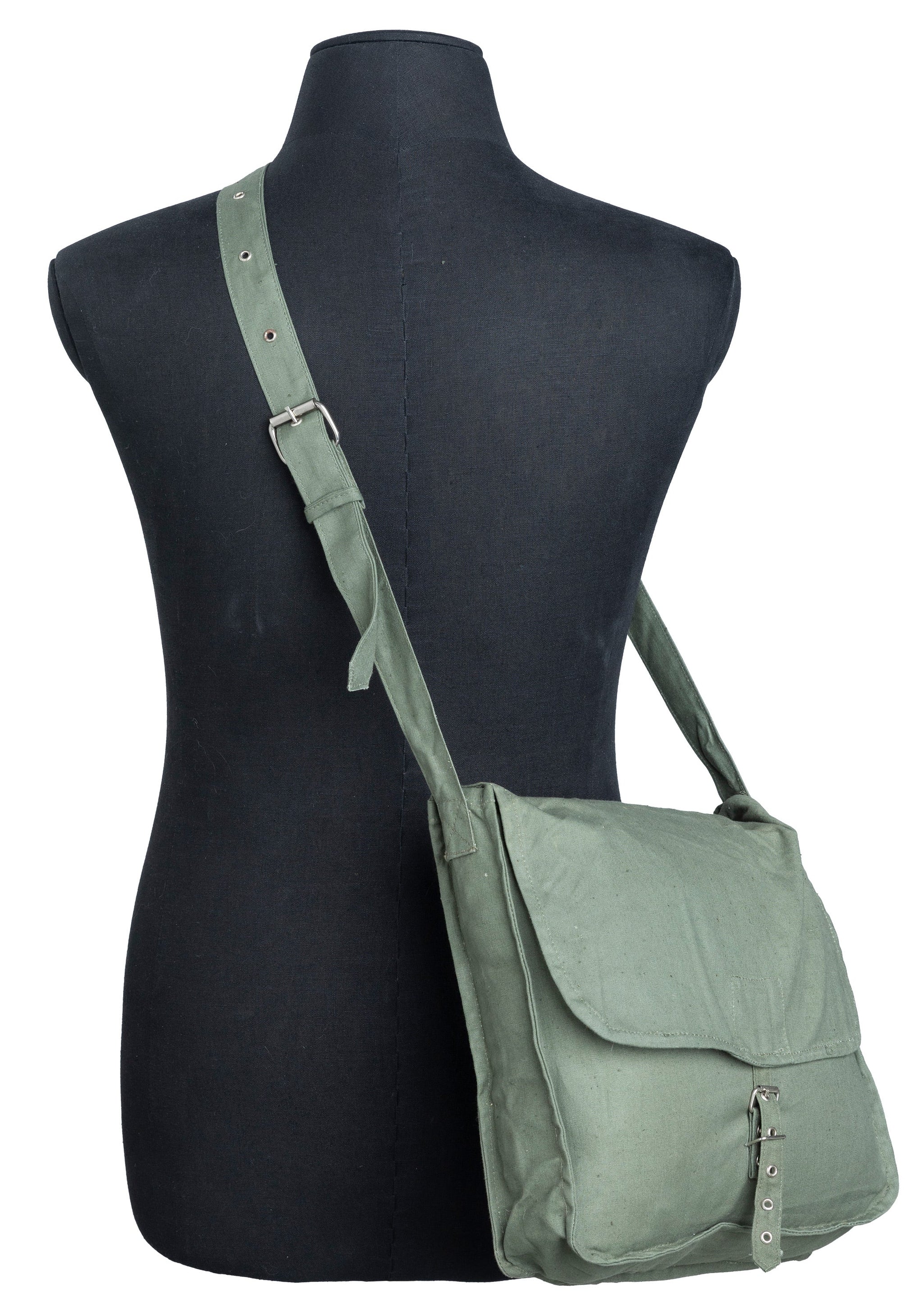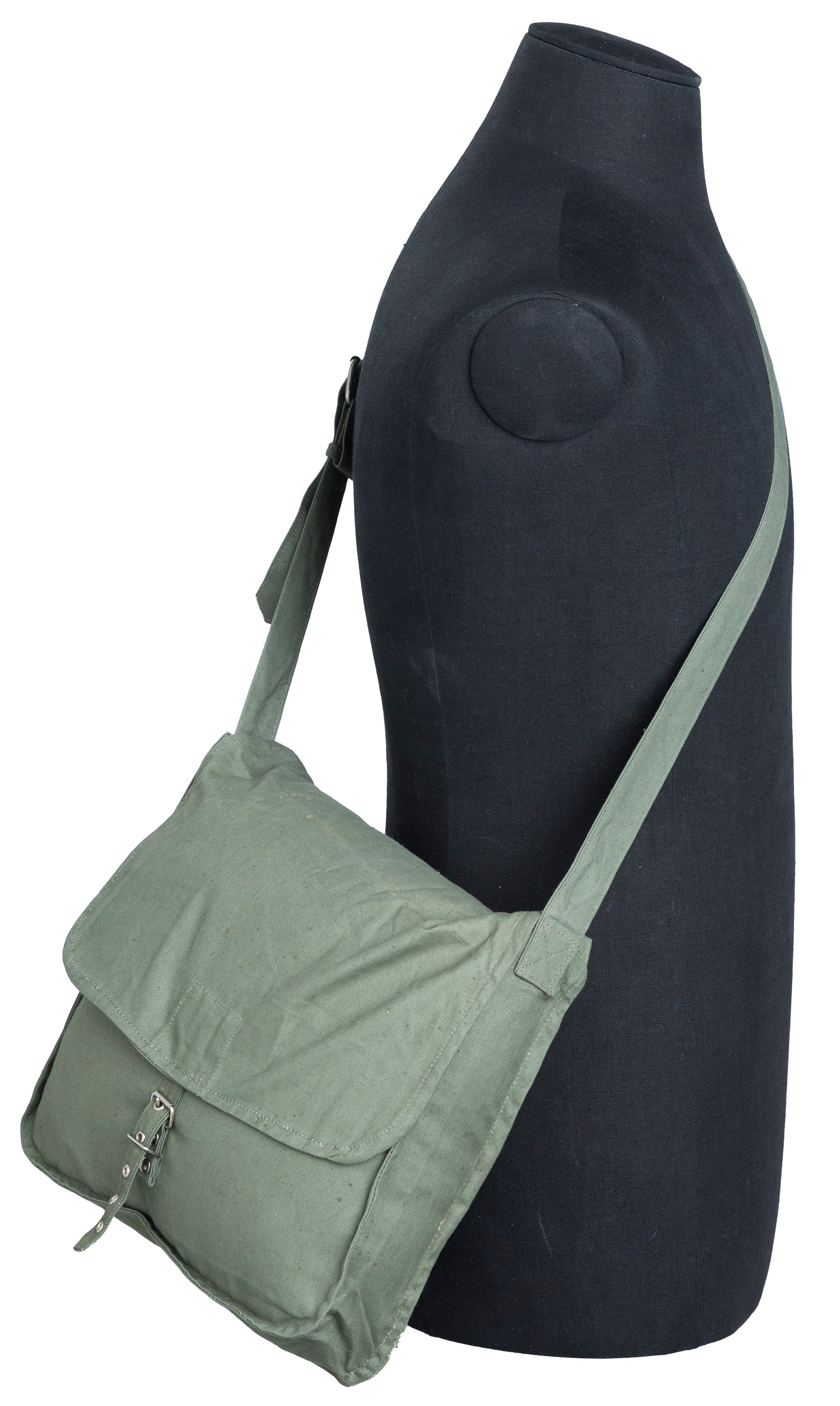 Dies ist möglicherweise eine neuere Version der bulgarischen Tasche, die wir seit einer Ewigkeit verkaufen, als die Welt noch jung und die Berge grün waren. Es ist ansonsten ähnlich, aber hier sind die Riemen aus Stoff statt aus Leder. Sie ähnelt stark den Umhängetaschen aus dem Ersten und Zweiten Weltkrieg, in denen die Soldaten vieles andere außer Brot transportierten. Es passt etwa ein Kilo Kartoffeln und einige andere Dinge hinein.