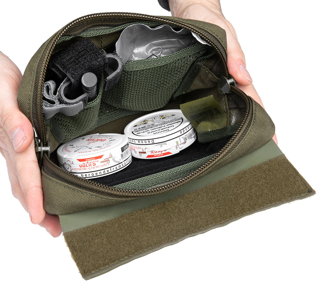 Ein hängender, baumelnder Mehrzwecktaschel zur Befestigung an Plattenträgern und anderen Westen und Lastenträgerplattformen. Bietet viel Platz und Organisationsmöglichkeiten, um allerlei Kleinteile griffbereit zu verstauen.