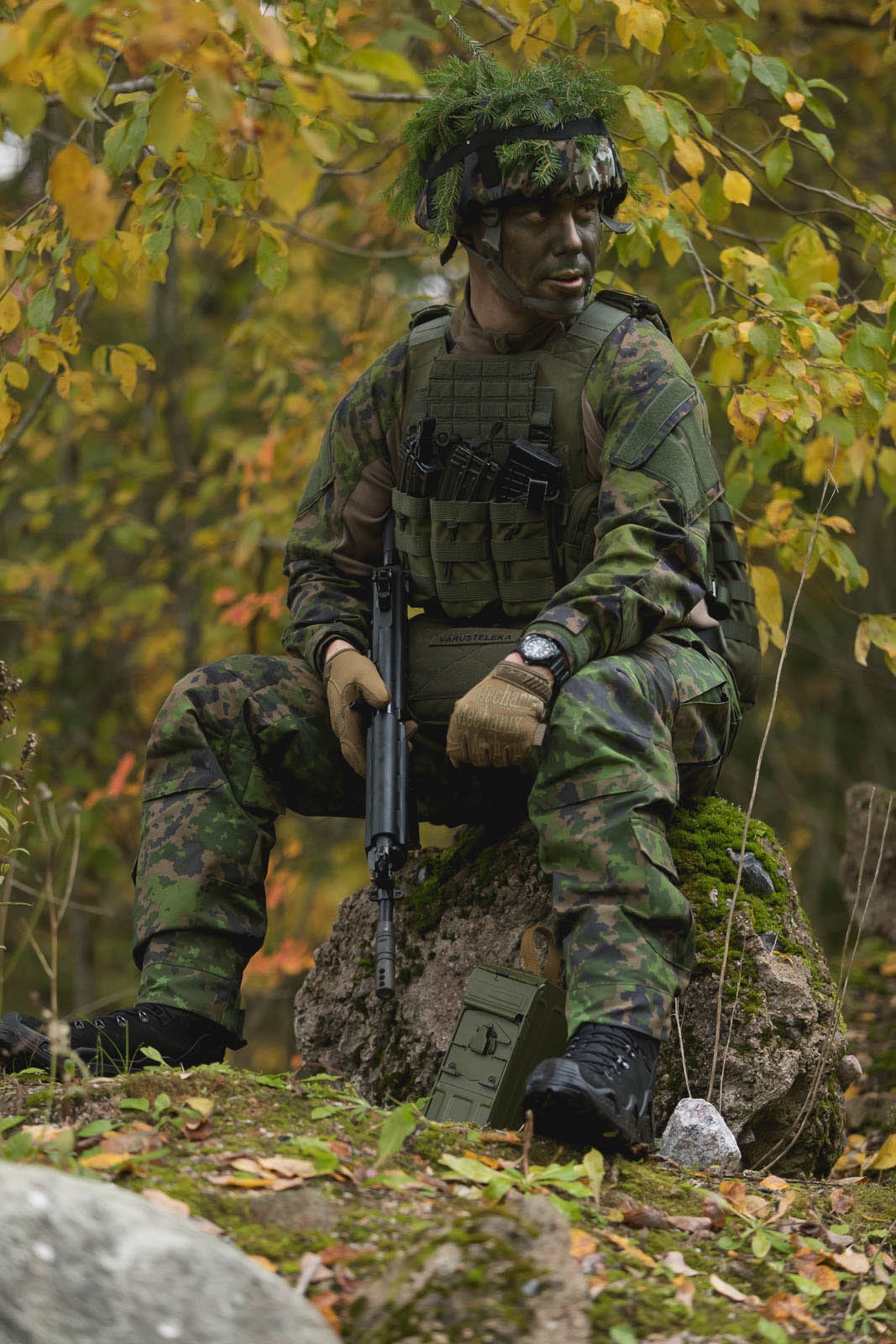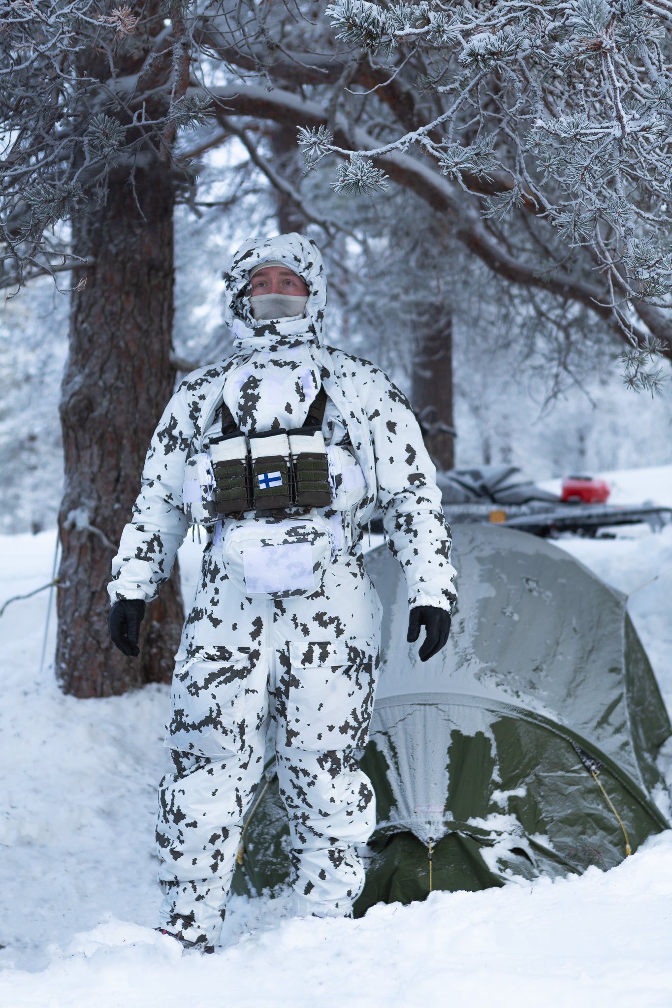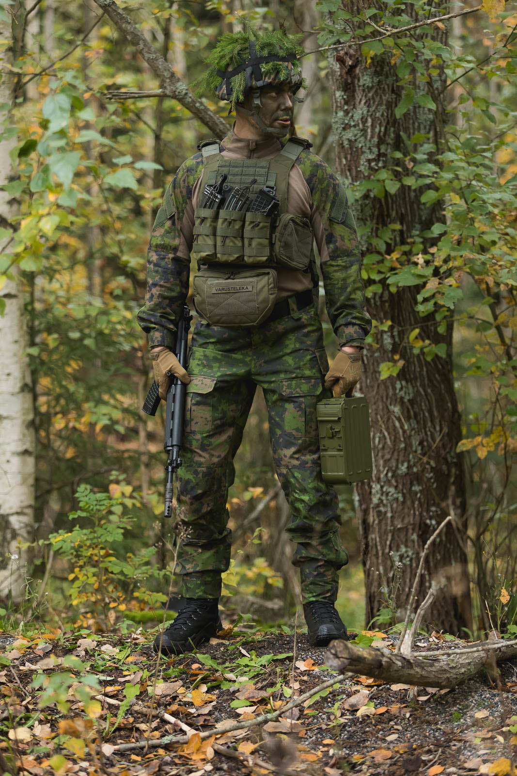 Die grünen Taschen und die mit M05-Waldtarnung werden in Zusammenarbeit mit Finn-Savotta Oy (Finnlands führender Hersteller von Militär- und Outdoorausrüstungund Hauptlieferant für tragende Ausrüstung der Streitkräfte Finnlands ) hergestellt. Je nach Situation werden die Produktionsläufe entweder in Savottas finnischer oder estnischer Fabrik genäht, manchmal sogar teilweise in Finnland und teilweise in Estland. Die kleinen aufgedruckten Etiketten verraten, wo genau jedes Produkt genäht wurde. Die M05 Schneetarnung Tasche wird in Tschechien von Finnlands CPE hergestellt.
