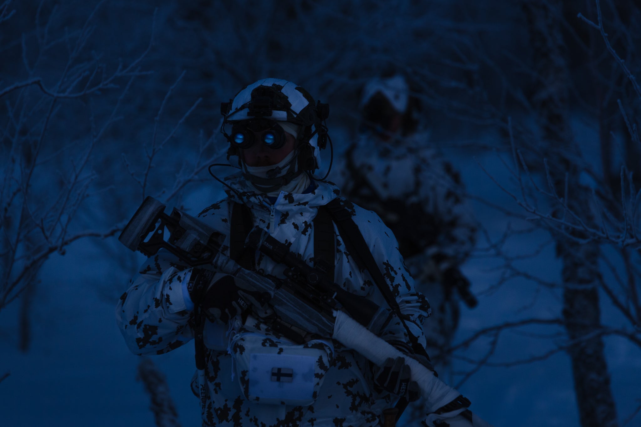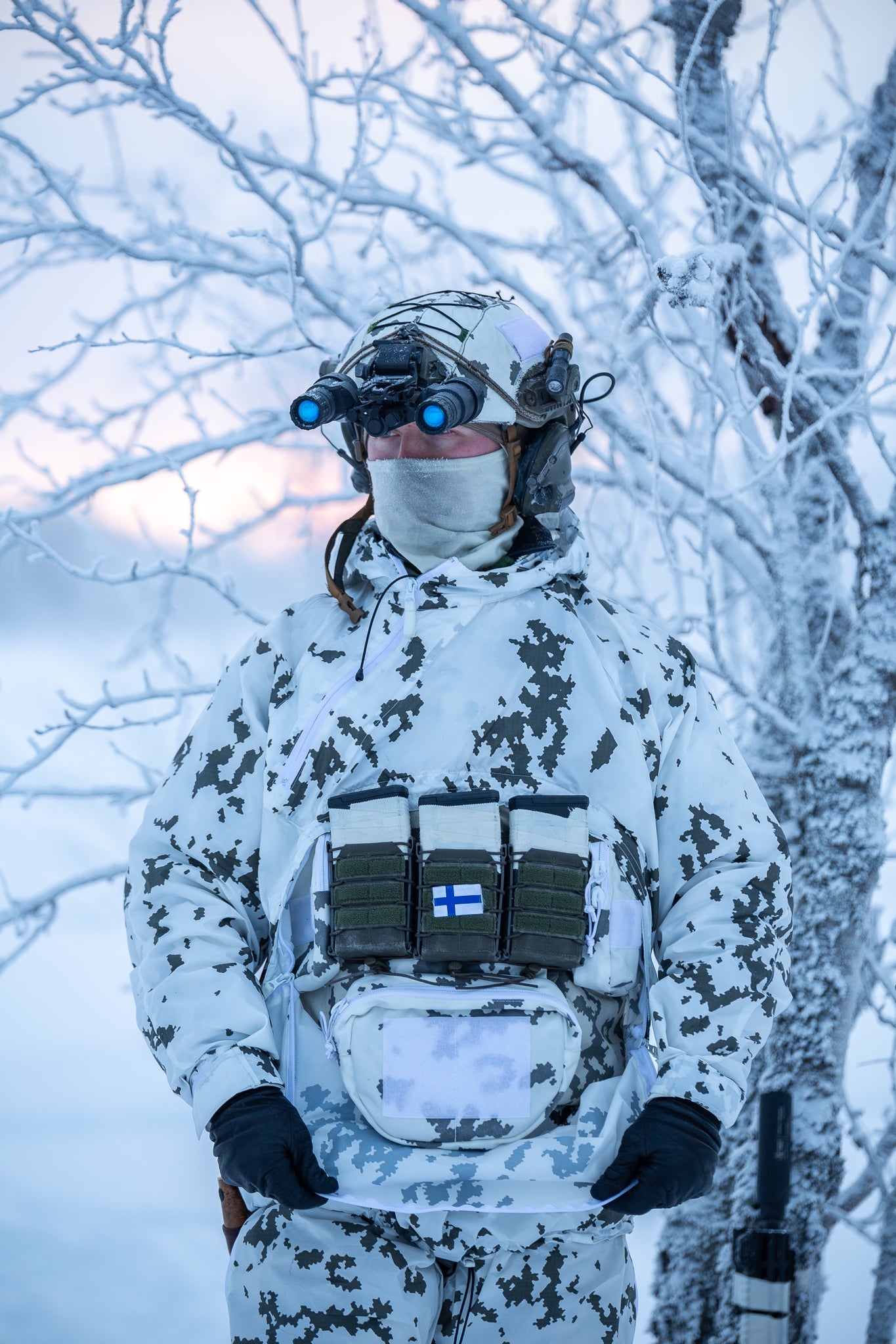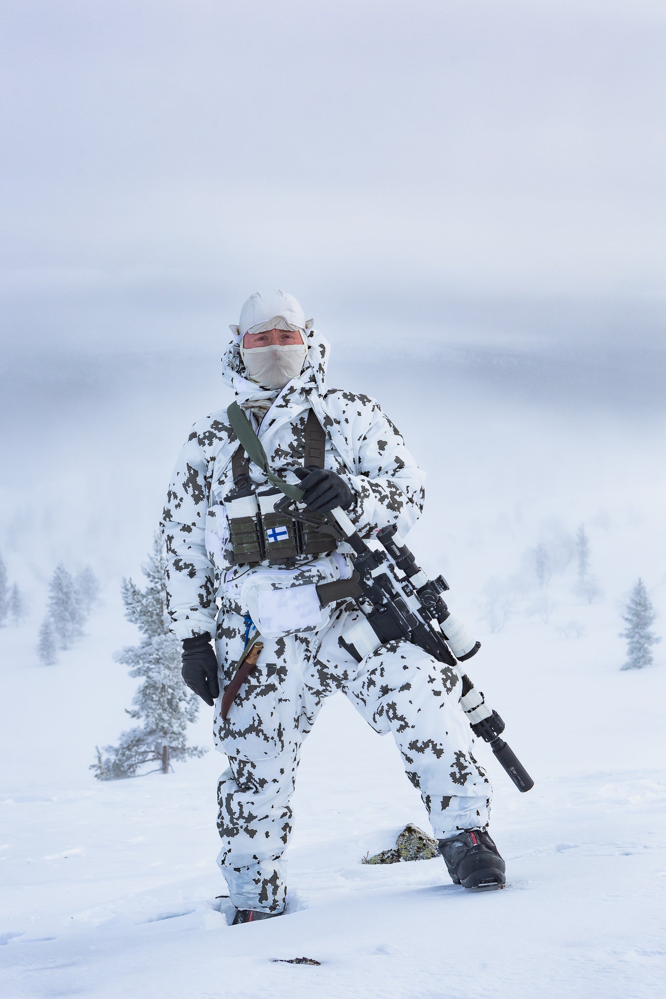 Die grünen Taschen und die mit M05-Waldtarnung werden in Zusammenarbeit mit Finn-Savotta Oy (Finnlands führender Hersteller von Militär- und Outdoorausrüstungund Hauptlieferant für tragende Ausrüstung der Streitkräfte Finnlands ) hergestellt. Je nach Situation werden die Produktionsläufe entweder in Savottas finnischer oder estnischer Fabrik genäht, manchmal sogar teilweise in Finnland und teilweise in Estland. Die kleinen aufgedruckten Etiketten verraten, wo genau jedes Produkt genäht wurde. Die M05 Schneetarnung Tasche wird in Tschechien von Finnlands CPE hergestellt.