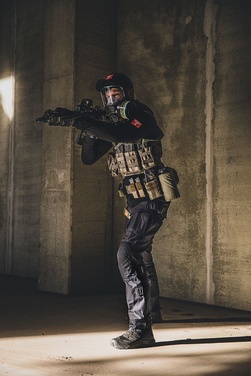 Das Tragen von langen Waffen mit Maske ist grundsätzlich umständlich, das gilt auch hier: Neigt man den Kopf zur Seite, hilft das beim Zielen mit Kimme und Korn; eine hoch angebrachte Optik erleichtert die Sache deutlich. Sie können das Gewehr nur mit der rechten Schulter anlegen, da sich der Filter links befindet.