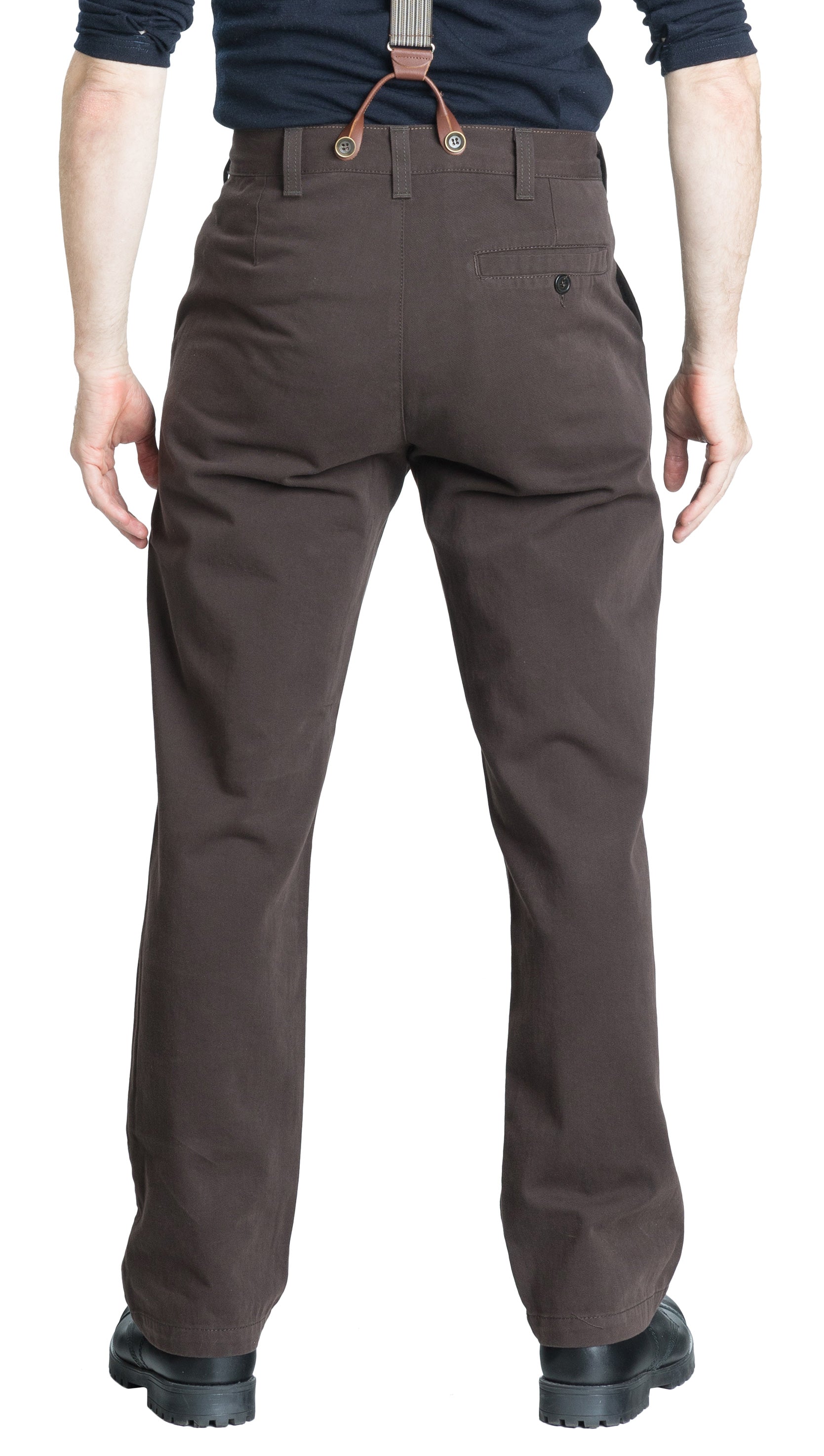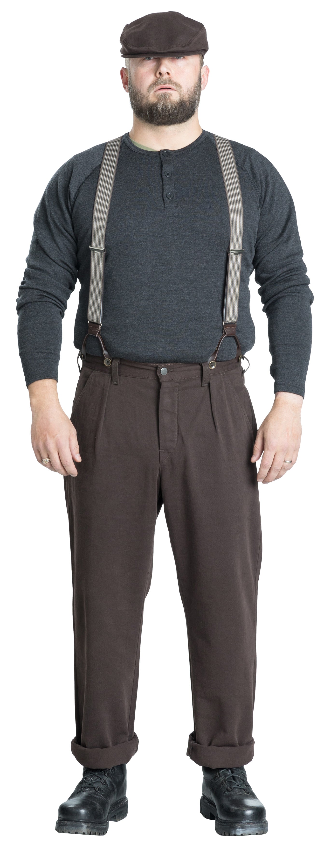 The belt loops are suitable for up to 50 mm (2") belts, but for the practical worker, we have included buttons for attaching proper braces. Wear them up when working; hanging braces signal that you are off duty. The fly is also buttoned.