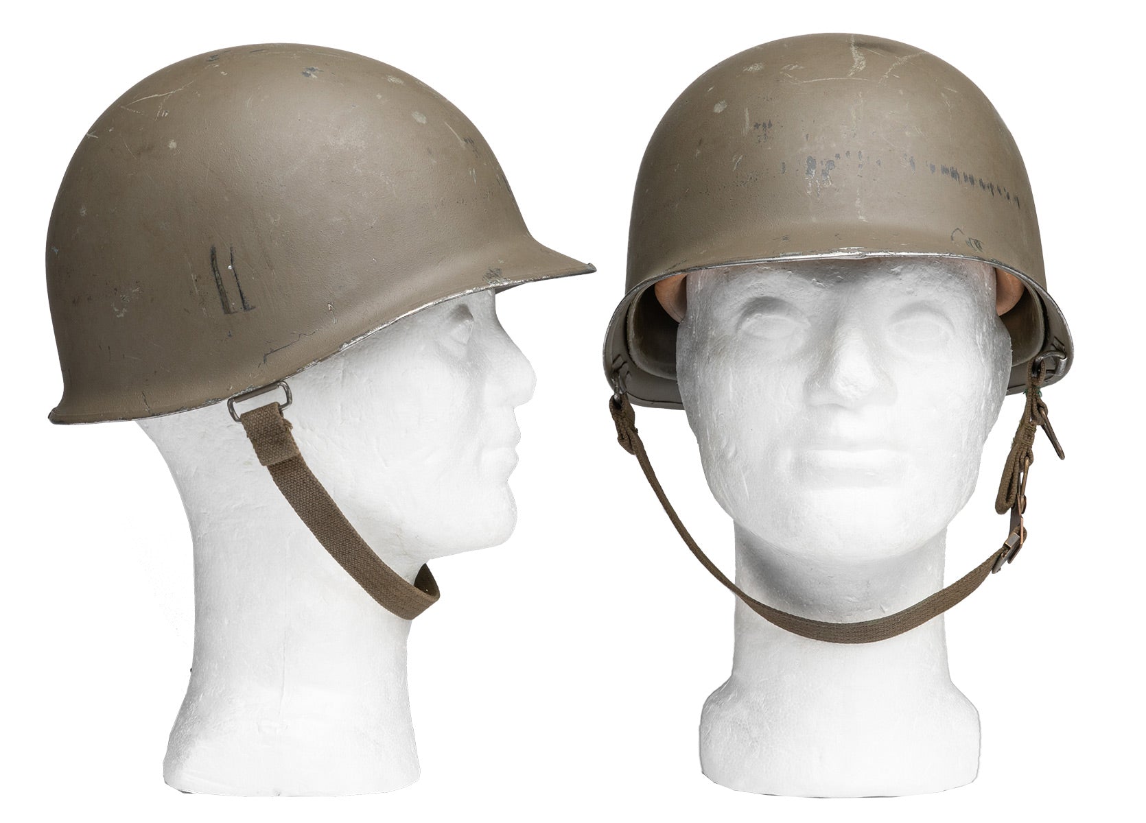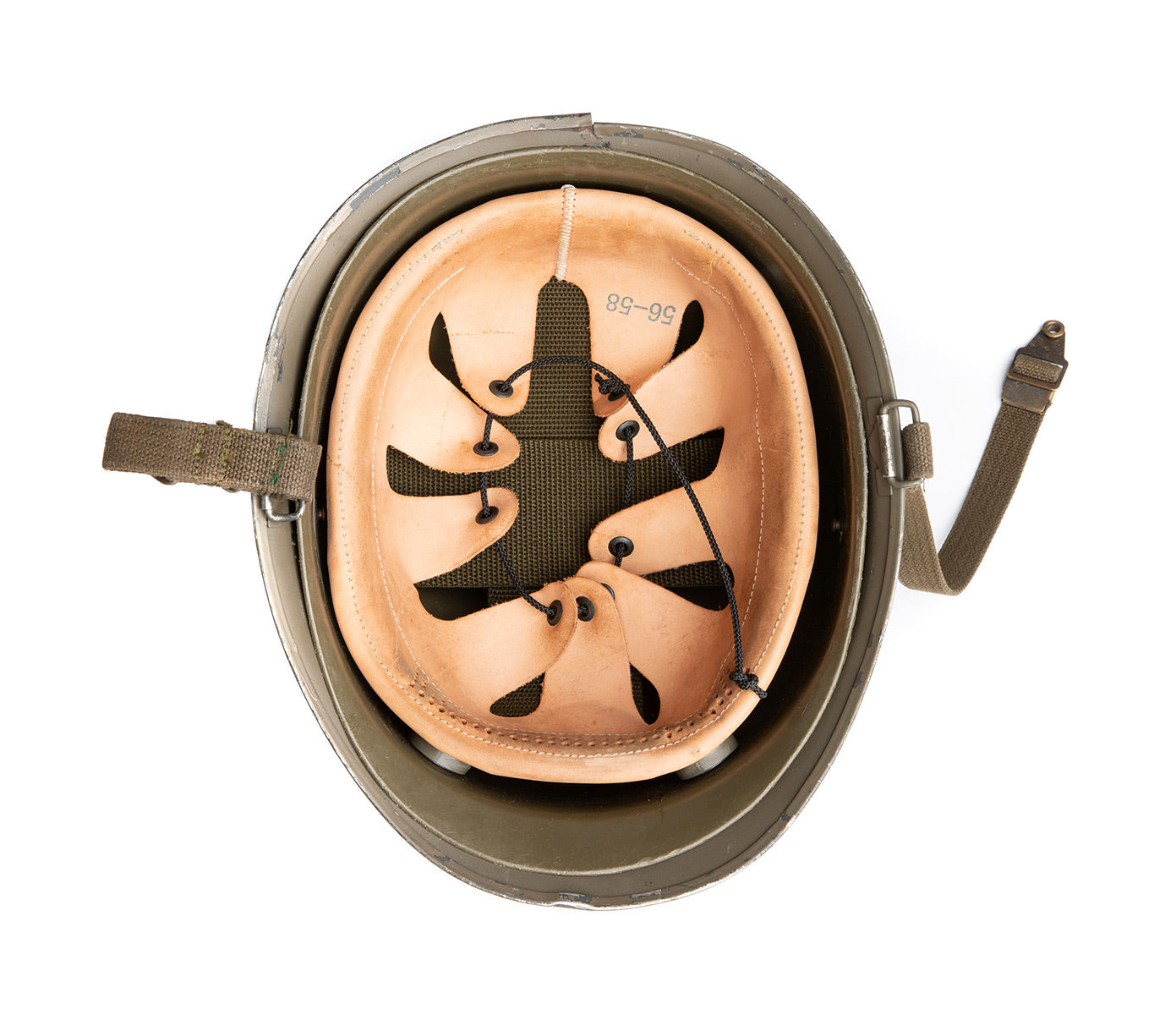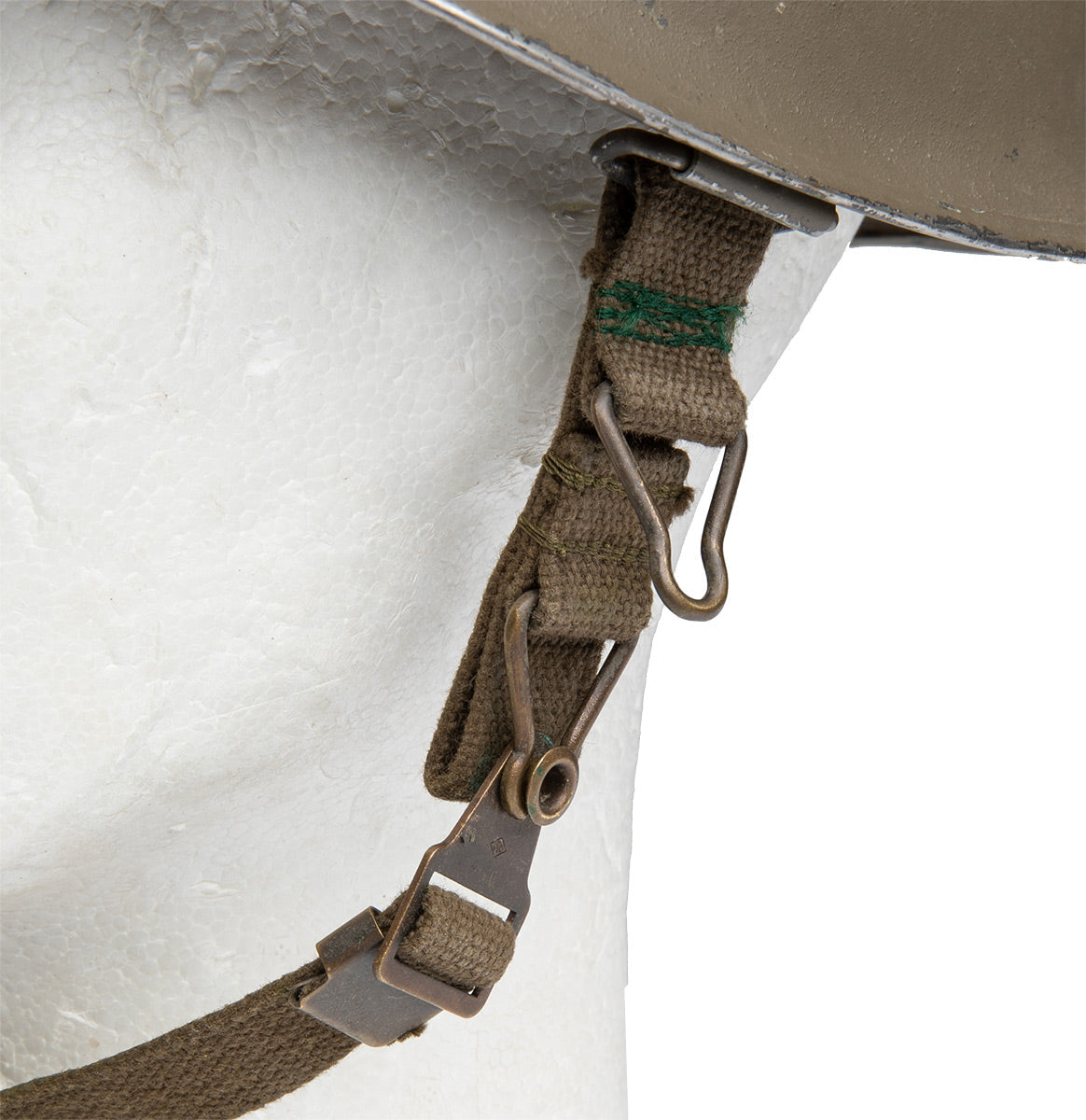 This piece of headgear consists of the steel helmet and the plastic liner that go on top of each other. The suspension system is attached to the liner. It was common to attach a camo net or a cloth cover on top of the helmet. The edges were shoved in between the helmet and the liner. These don’t have such a contraption but you can easily make one if you want. The weight in total is c. 1.6 kg (3.5 lbs).