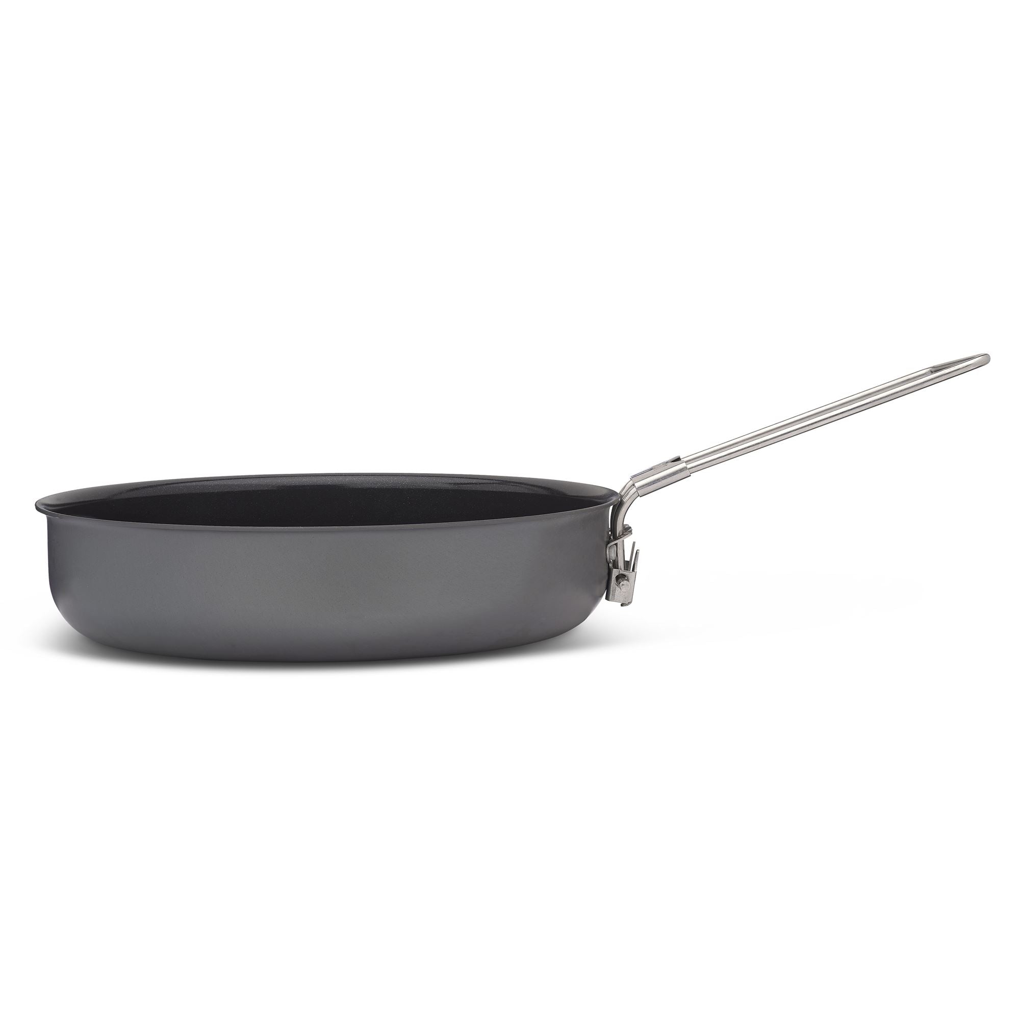 Lightweight hard-anodized aluminum frying pan for camping, hiking, and all sorts of outdoor cooking. Ideal for 1-2 people. Diameter 21 cm (8.5"), non-stick coating. Packing up is easy-peasy with a handle that folds away under the pan. A cotton storage bag included.