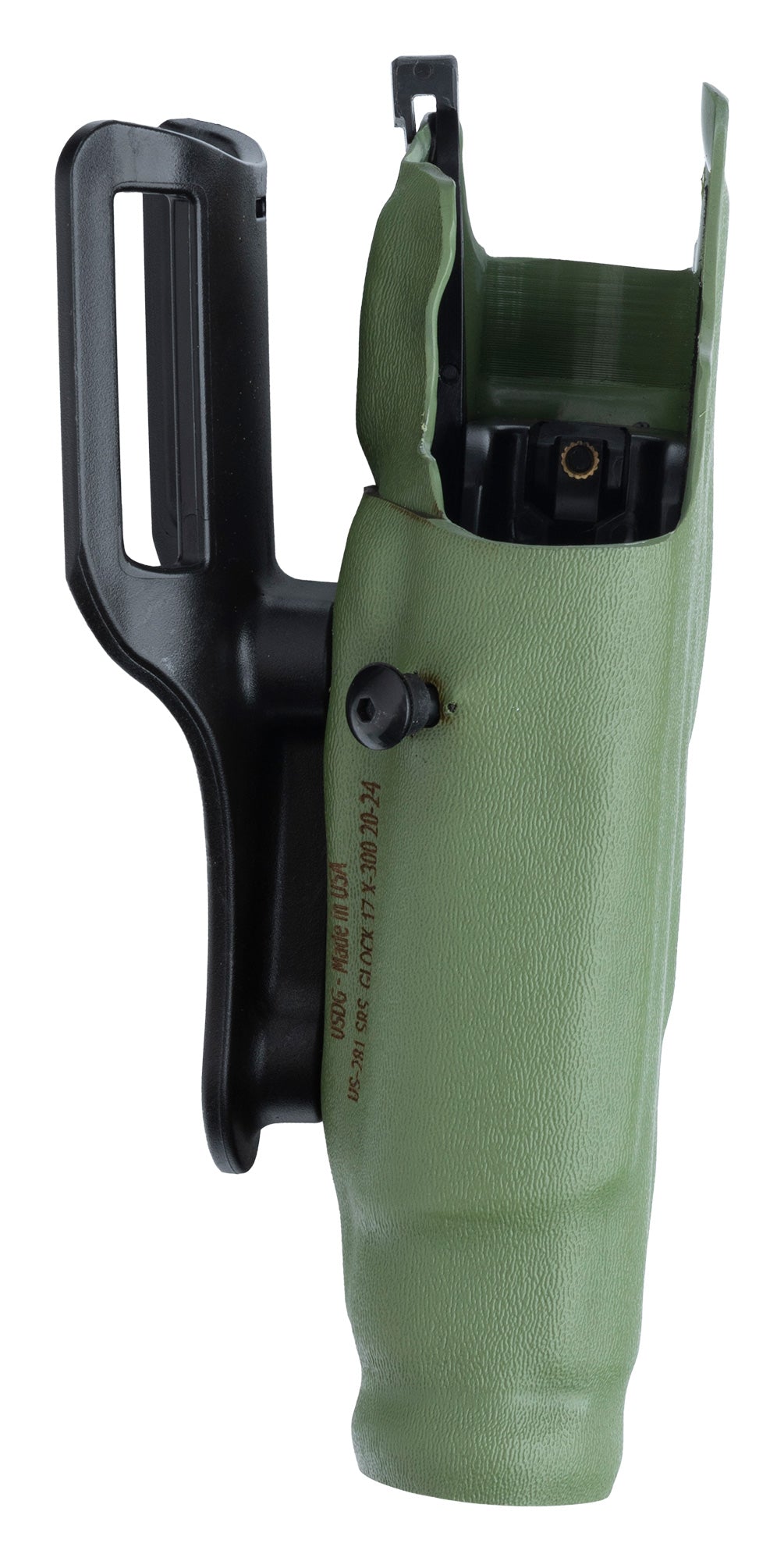 The holster is designed for use with a weapon light. However, as the pistol is secured in the holster by a plastic stopper that engages the muzzle, the SRS mechanism that locks into the ejection port (depending on the model), and the trigger guard base that presses against the holster frame, the pistol locks in place even without a weapon light – and the light can be smaller than the one the holster is optimally designed for. There is also an adjustment screw under the holster to tighten the fit to your taste.