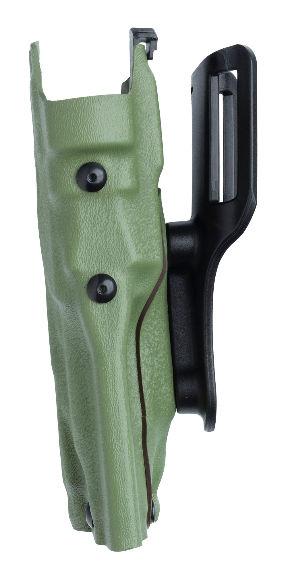 The holster comes with a mid-ride belt loop. The loop fits belts up to 58 mm / 2.25" wide. The belt loop attaches to the holster with a three-screw pattern similar to Safariland – so you can attach other mounting accessories that follow the same blueprint (like QLS or Blade-Tech equivalents).