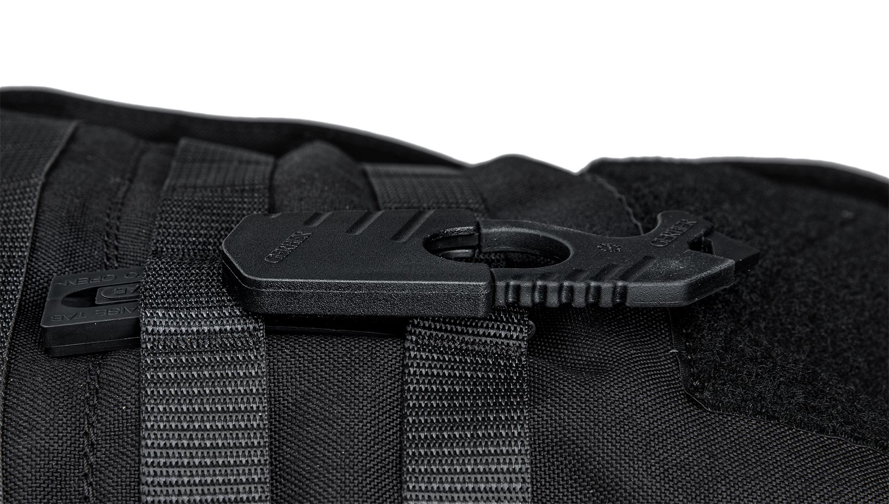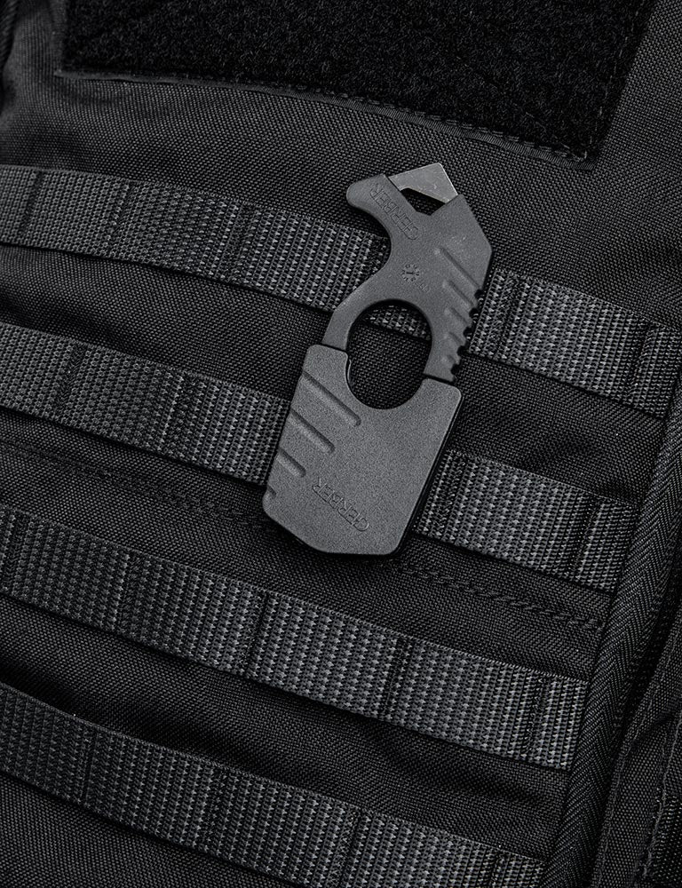 The Gerber cutter is made from a single piece of 3 mm steel with a rubber-coated handle. It's fairly light and tiny, and a large cut-out serves as a finger-hole to keep the tool in control even with gloves on. The pommel has a lanyard hole and a glass breaker tip - which is often necessary in the same situations where you'd cut a seatbelt.