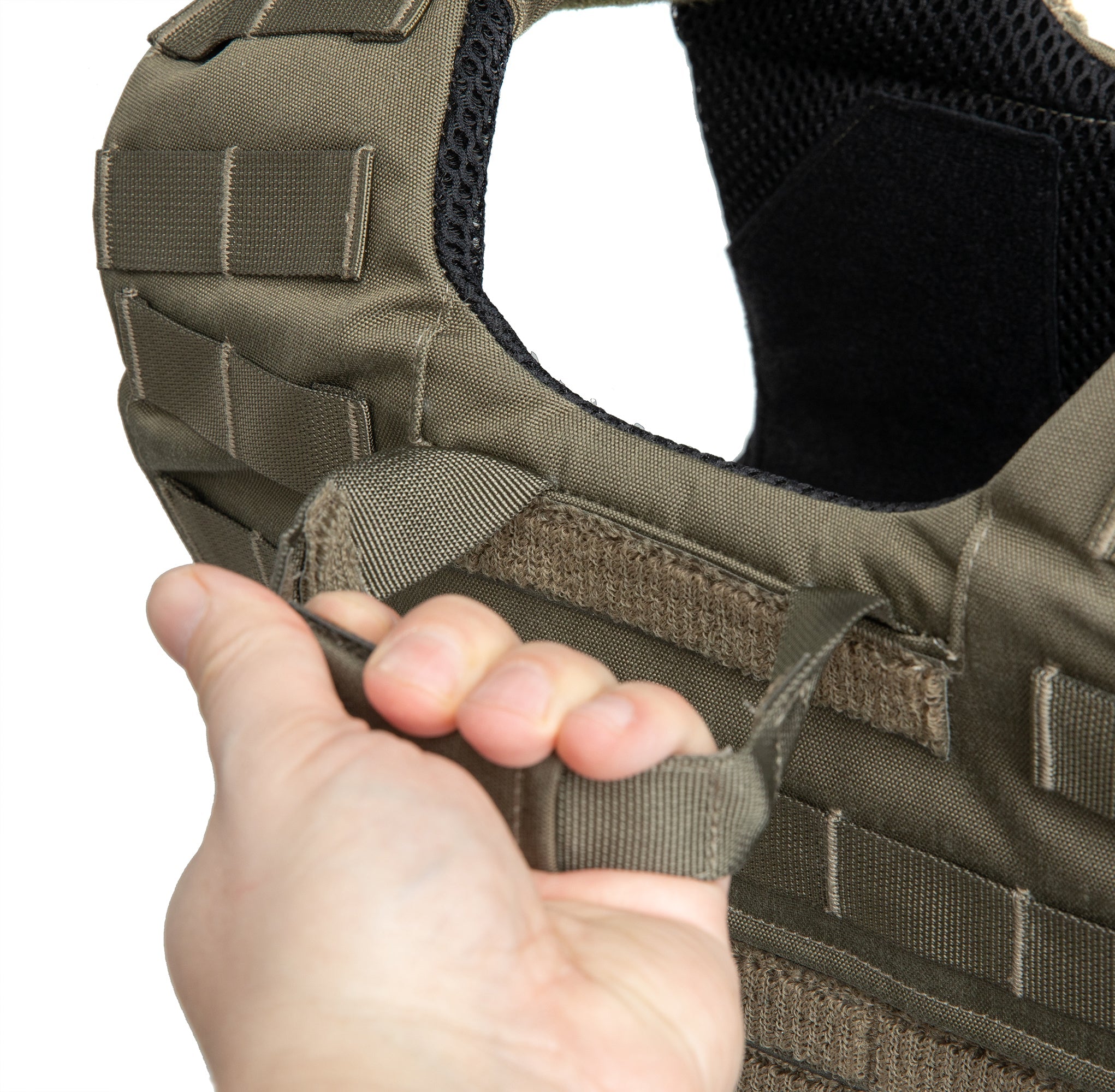 The previous two-sided closure at the sides is now a simpler lift-the-lid as seen on many plate carriers. This makes donning the vest easier and allows for a greater range of immediate changes to handle variations in clothing thickness. Coarse adjustments are made on the backside with a similar simplified system; weaving a drawcord thru numerous loops is no longer required. The rear part has its own elastic cummerbund, as before.