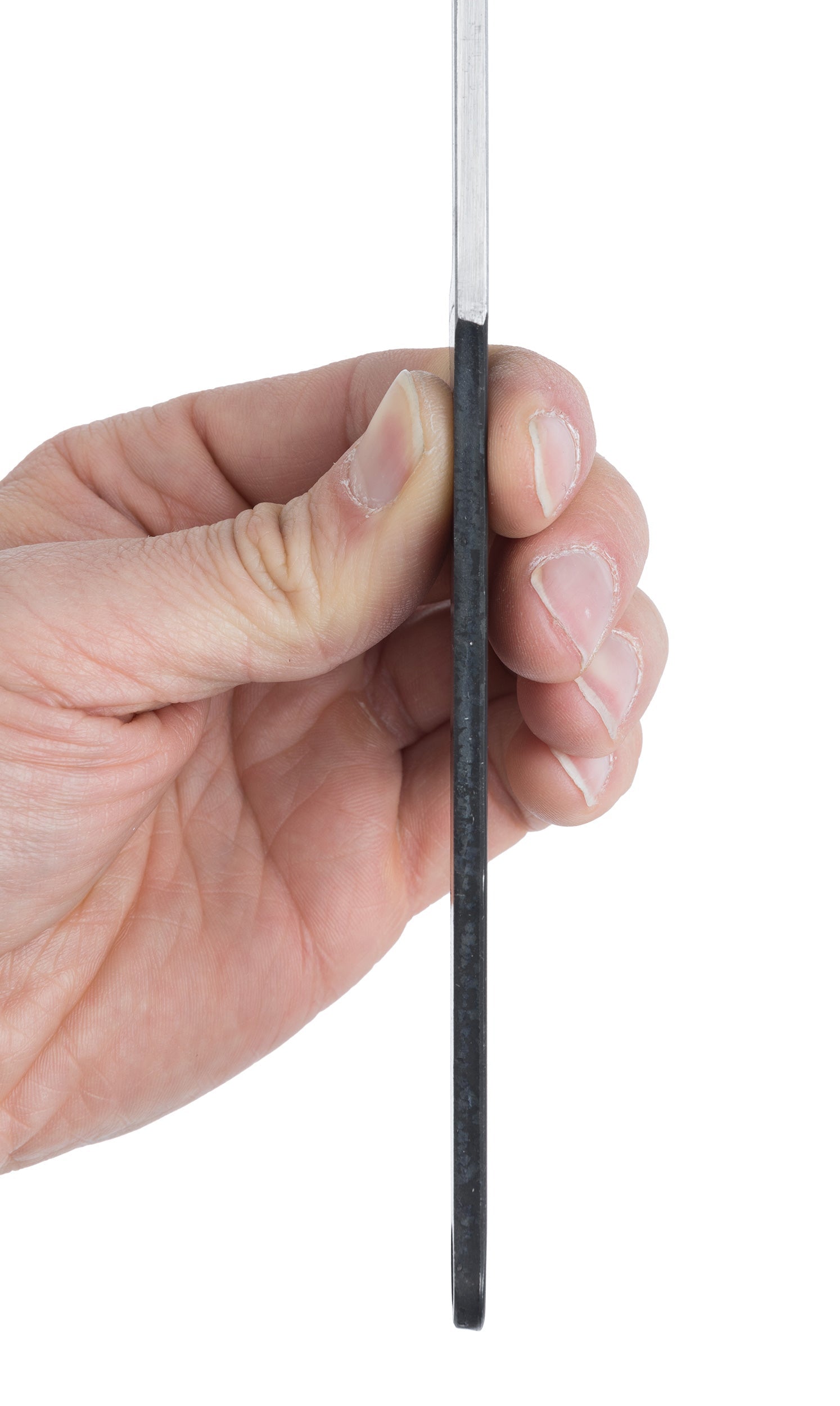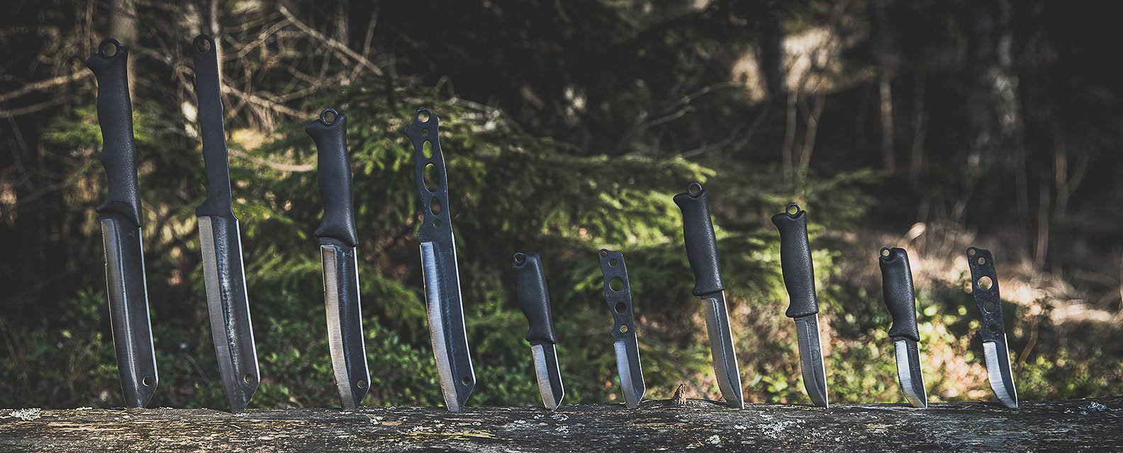 All Varusteleka carbon steel knives are made from 80CrV2 tool steel, a trusted choice in Finnish knife manufacturing for decades. The heat treatment leaves the surface of the steel softer, c. 52 HRC. This creates a tough exterior to protect the blade. When the blade is ground, the harder (c. 59 HRC) inside is revealed, which improves edge retention. The spine has ground bevels for striking Ferro rods.