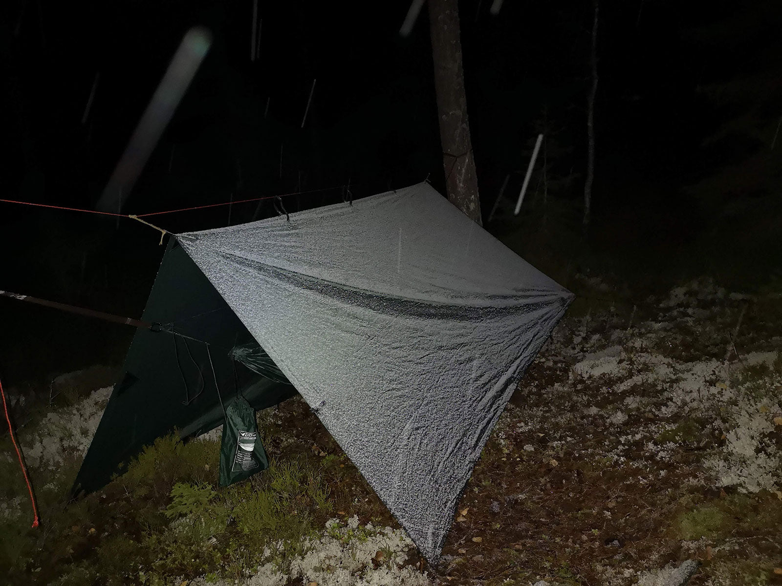 Very fine insect net, no known bloodsucker will go through the tiny holes. Comes with poles to keep it further away from the sleeper, but these are optional. If the net is not needed, the hammock can just be flipped over so the net remains on the bottom. However, the net can be kept open too, and pitching it is just a matter of tying two ropes.