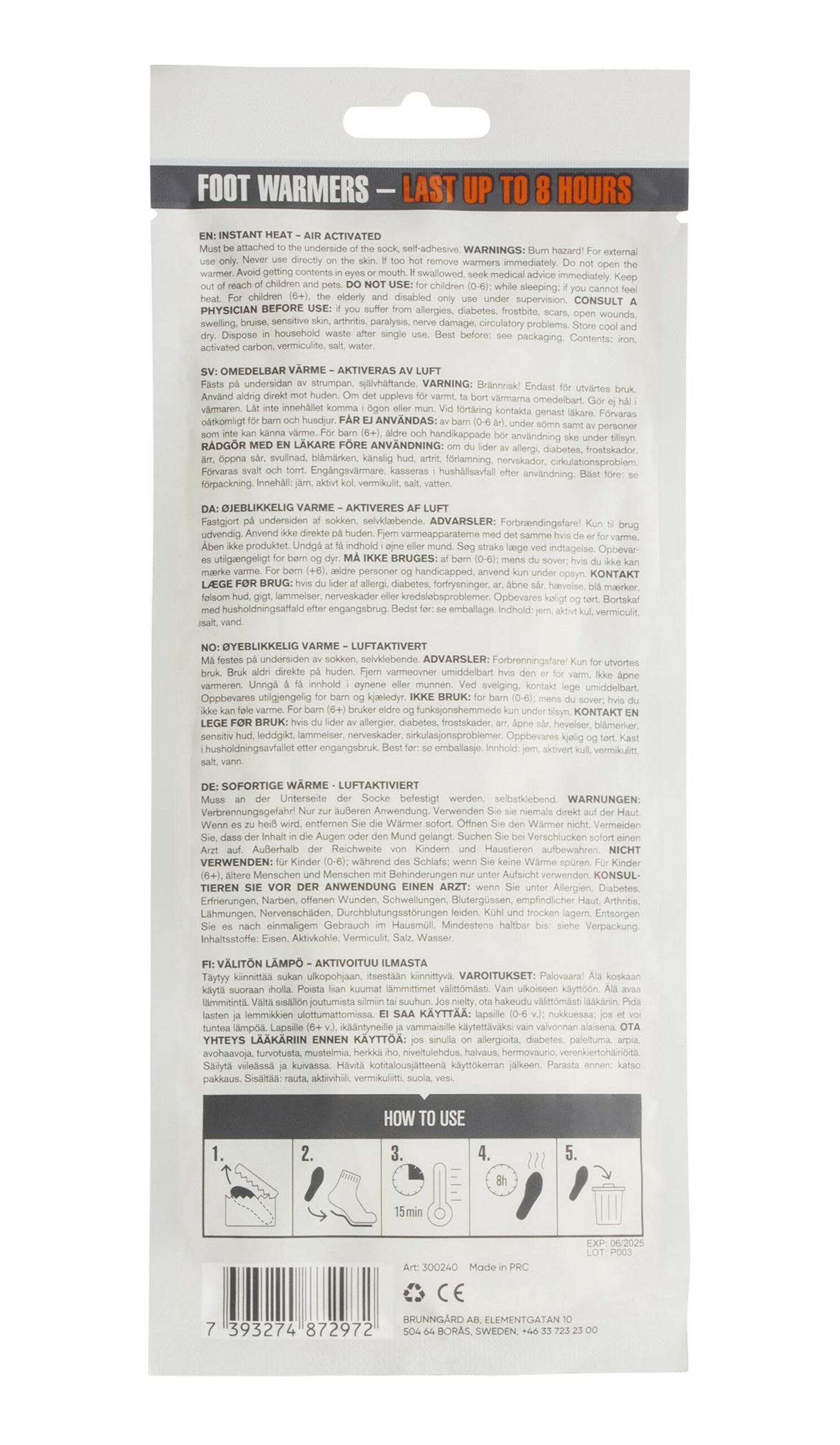 Disposable foot warmers for hiking boots, ski boots, and whatever winter shoes you see fit. Excellent for everything where you need to stay outdoors for extended periods of time and for people whose feet get easily cold. These keep them warm for up to 8 hours. One size, L (EUR 41-44 / US 8.5-.11).