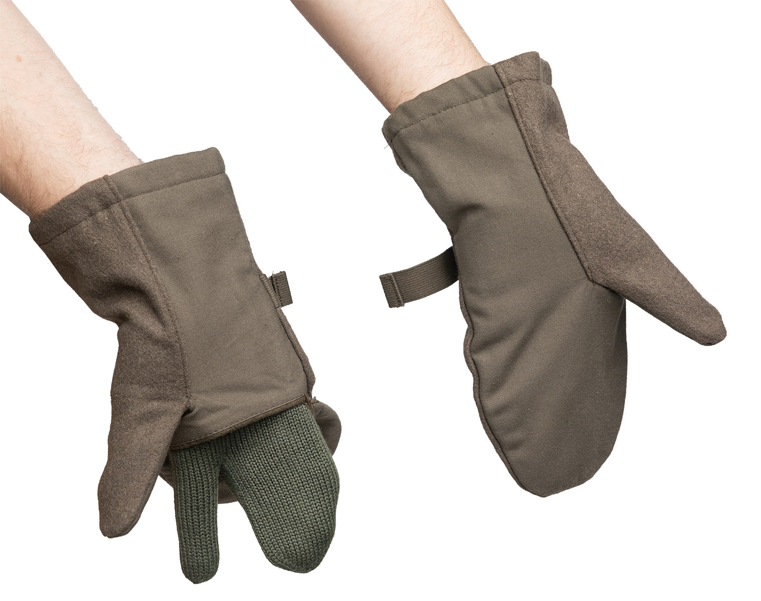Adding a trigger finger to ordinary mittens allows you to use the index finger not only for shooting but cycling and other outdoor activities as well. Civilian manufacturers make lobster gloves with a similar idea but these army versions separate just one finger for one obvious reason. (Picking your nose.) These are plain mittens that work especially well as a liner under a dedicated shell mitten but also on their own.