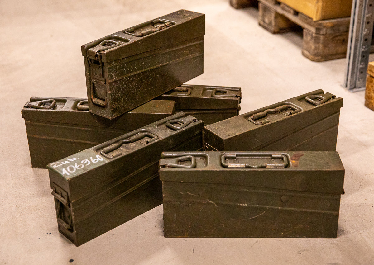 The Bundeswehr 7.62 mm NATO ammunition belt box, for the MG1, MG2, and MG3. Steel construction with a simple latch lock and foldable carrying handle. A very secure box with a different look compared to US .30 cal boxes but essentially the same function.