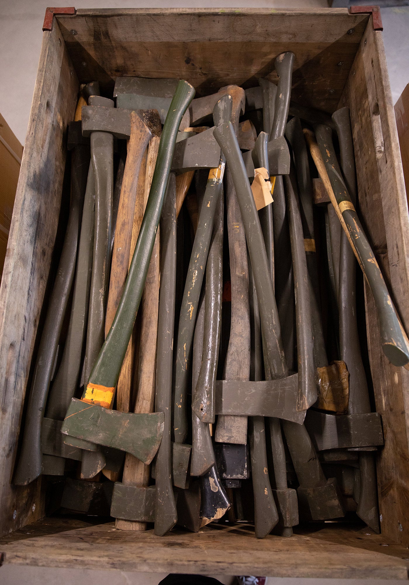 Green Dutch military axe from the side Green Dutch military axe from the side A close up of the green Dutch military axe head from the right side. A close up of the green Dutch military axe head from below A close up of the green Dutch military axe head from the left side. Two wooden handled Dutch military axes side by side. A pile of Dutch military axes. Dutch Big Axe, Surplus Dutch Big Axe, Surplus Dutch Big Axe, Surplus Man holding an axe Man holding an axe
