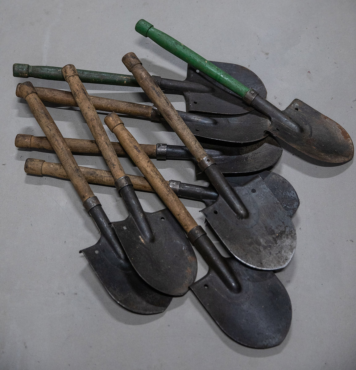 These are pretty old, and used with the love and care usually associated with vast East Bloc conscript armies. All are "intact", meaning the shaft might wobble a bit (normal with military spades), but such a "problem" is rather easy to fix. The details and length of the shaft piece might vary from shovel to shovel, some are even painted green.