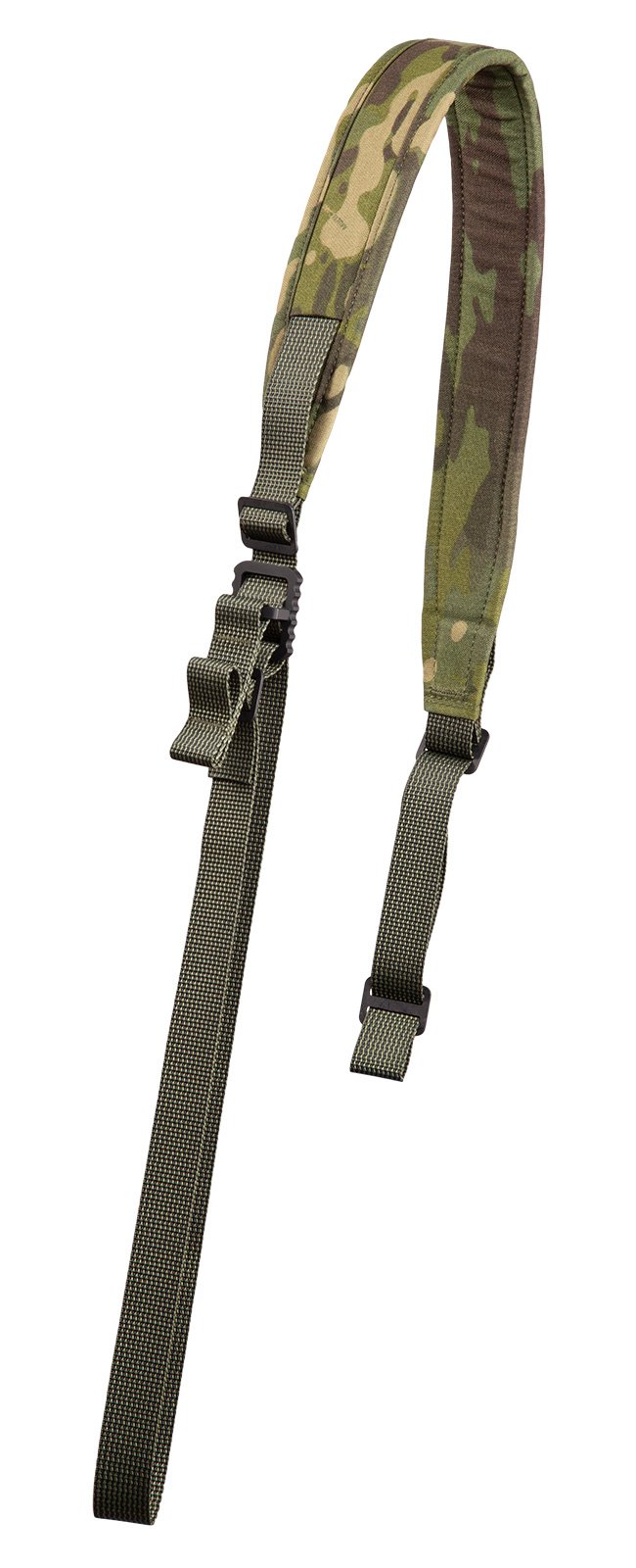 As this is a modern two-point sling, you don’t need to play around with numerous ends of webbing, just two. The 25 mm / 1 " webbing fits most sling swivels and mounting hardware out there. We make these with long enough webbing ends to fit around most people.