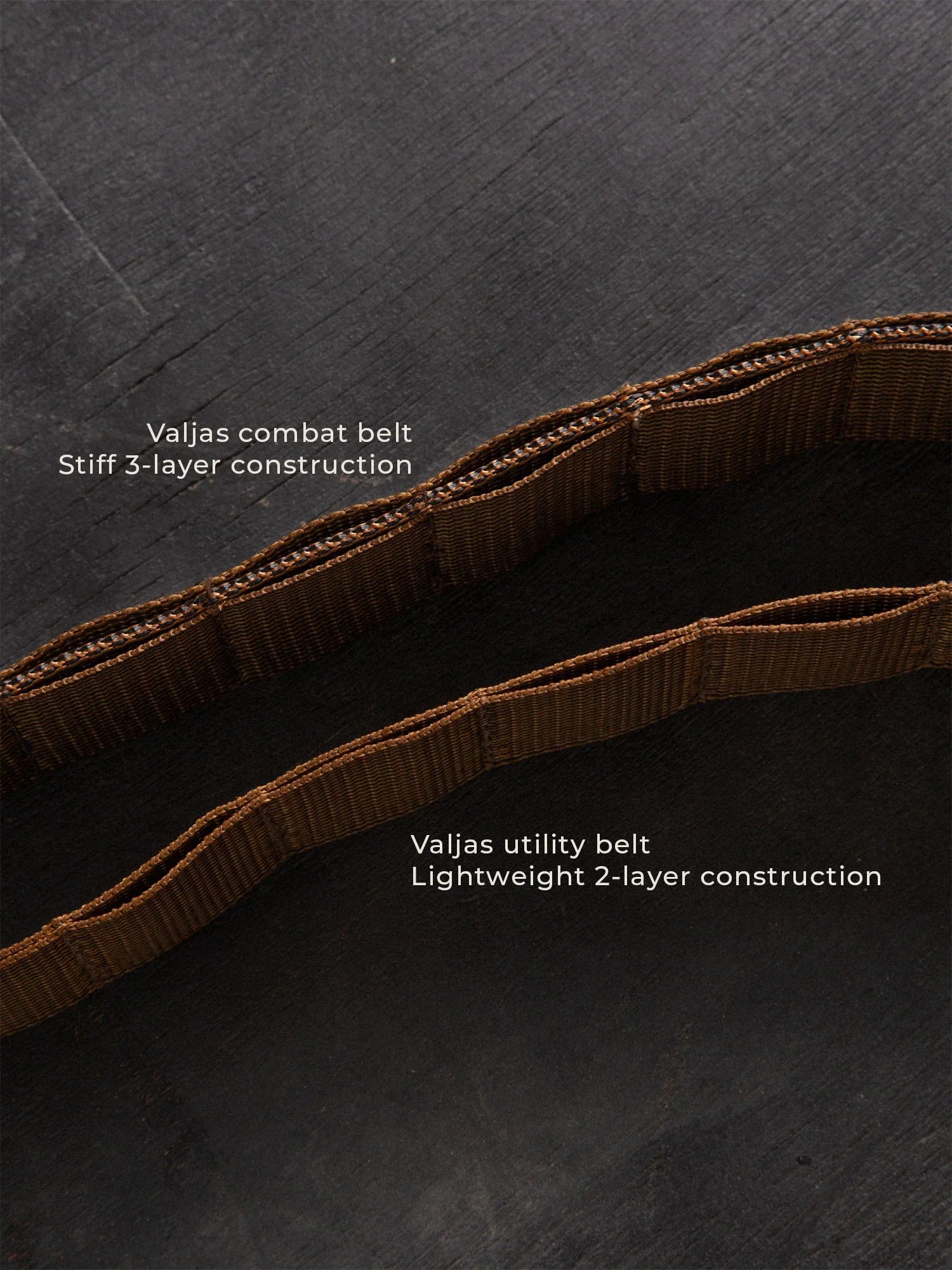 The belt consists of two layers of webbing sewn together, creating PALS channels between them for attaching pouches. There’s no stiffening layer – if you need a more rigid belt, check out the Savotta Valjas Combat Belt.