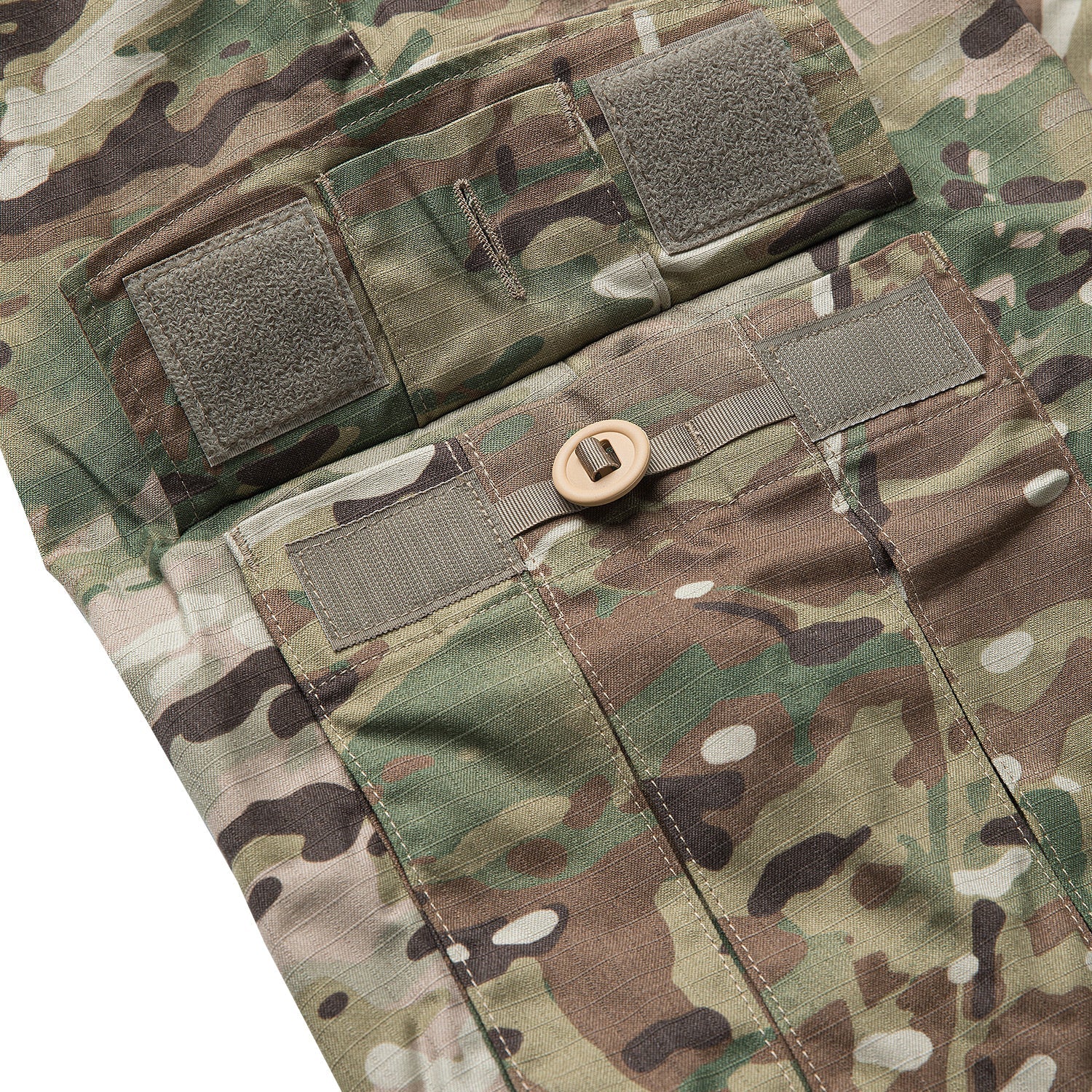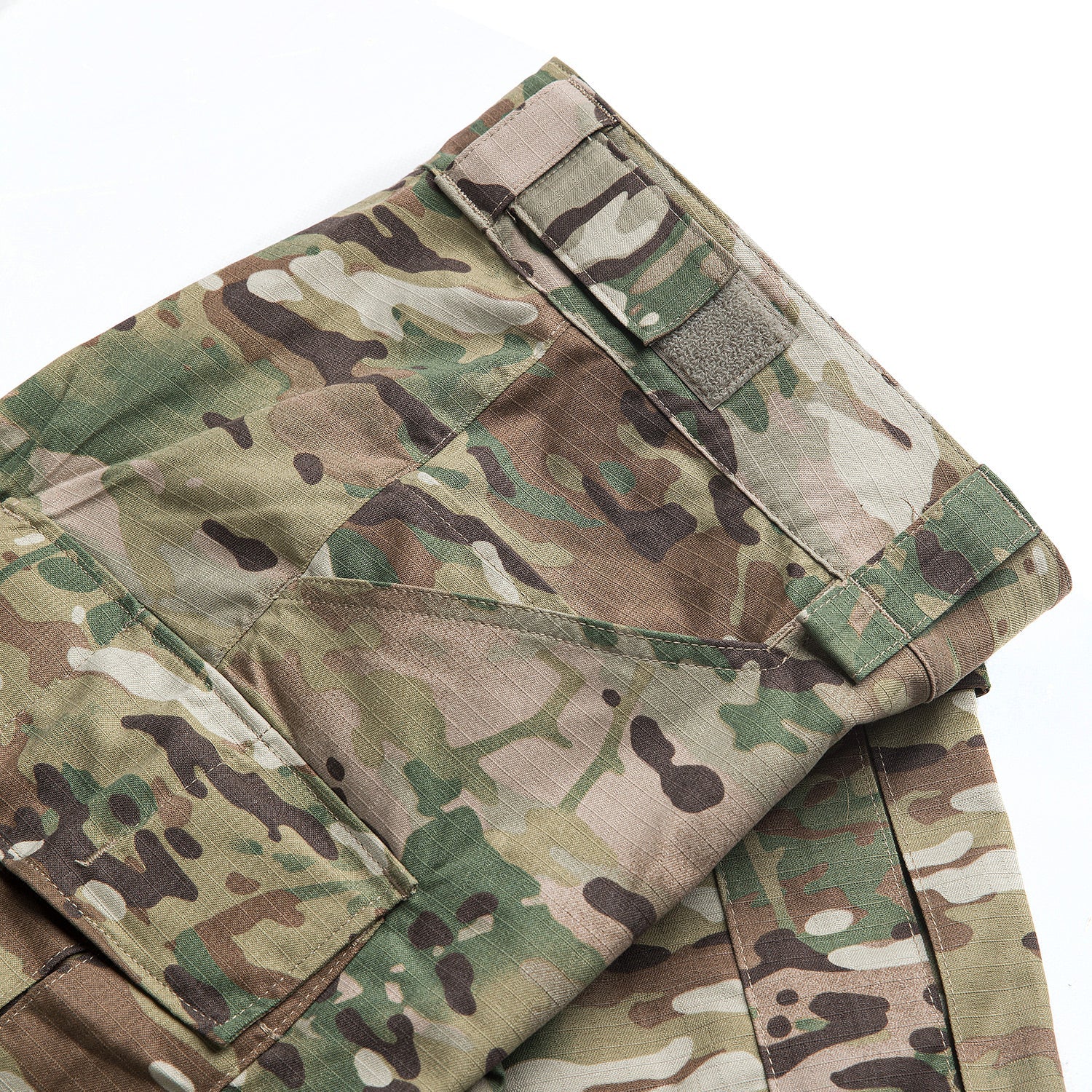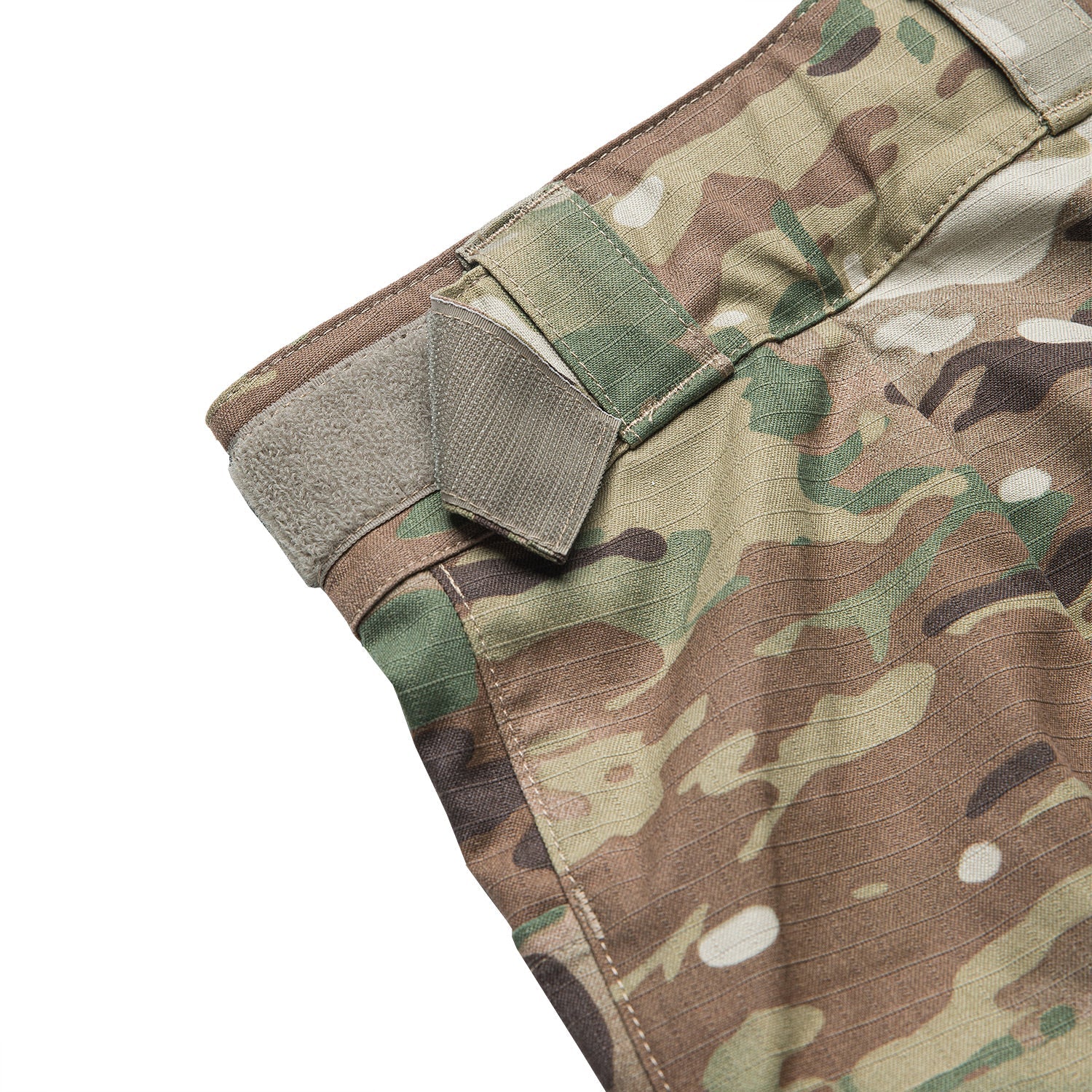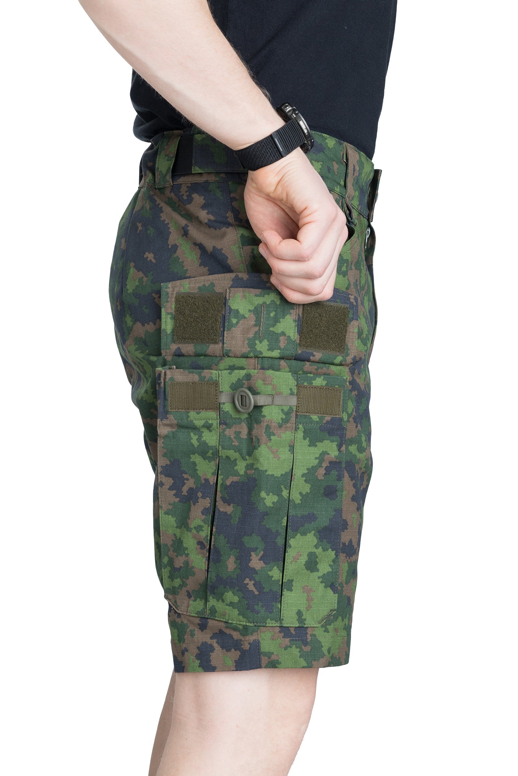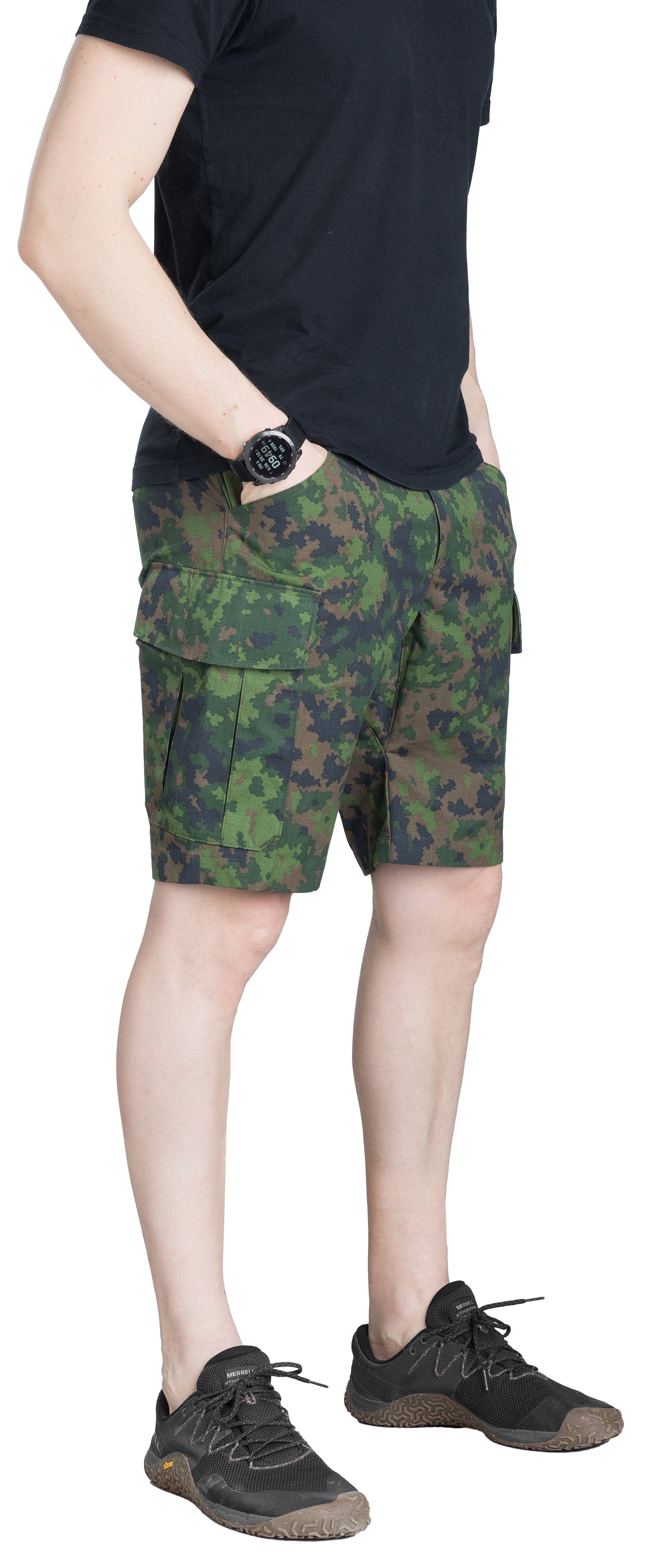 These shorts are made from tough ripstop-reinforced fabric. The M05 woodland fabric is made from 50% cotton and 50% polyamide, weight 225 g/m2. The MultiCam is 48% polyamide, 48% cotton, and 4% XLA (elastane), weight 219g/m2. Elastane in the MultiCam fabric makes it a bit stretchy. The M05 fabric is a bit heavier. Both are very good for active use. The ripstop reinforcement prevents the small cuts and holes in the fabric from tearing further.