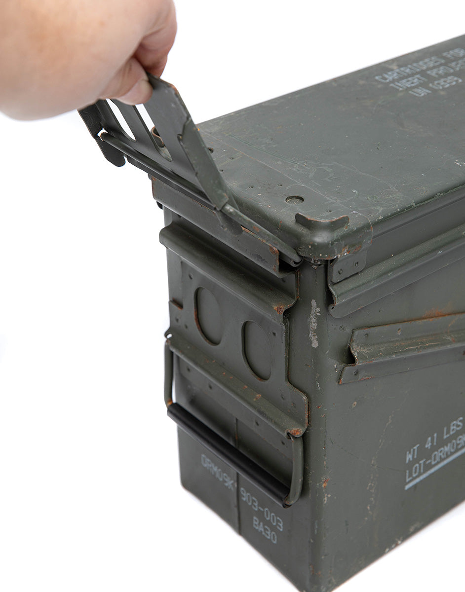 If the .50 cal can is too tiny for you, here’s a notch bigger ammo box, designed for 40 mm grenades. Very heavy metal. Doesn’t break that easily. Why carry your beer into the park in a bag, when you can do it in style!