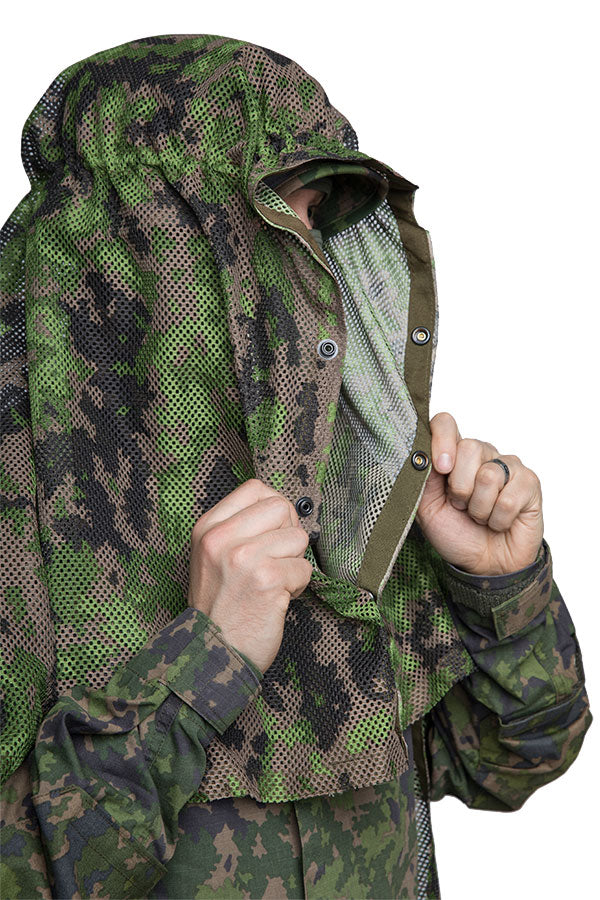 100% polyester, weight 260 g/m2. The base mesh fabric is the same, which is used in many pieces of the Finnish Defence Forces M05 load-bearing system, simply printed in M05 camouflage instead of just being dyed solid green.