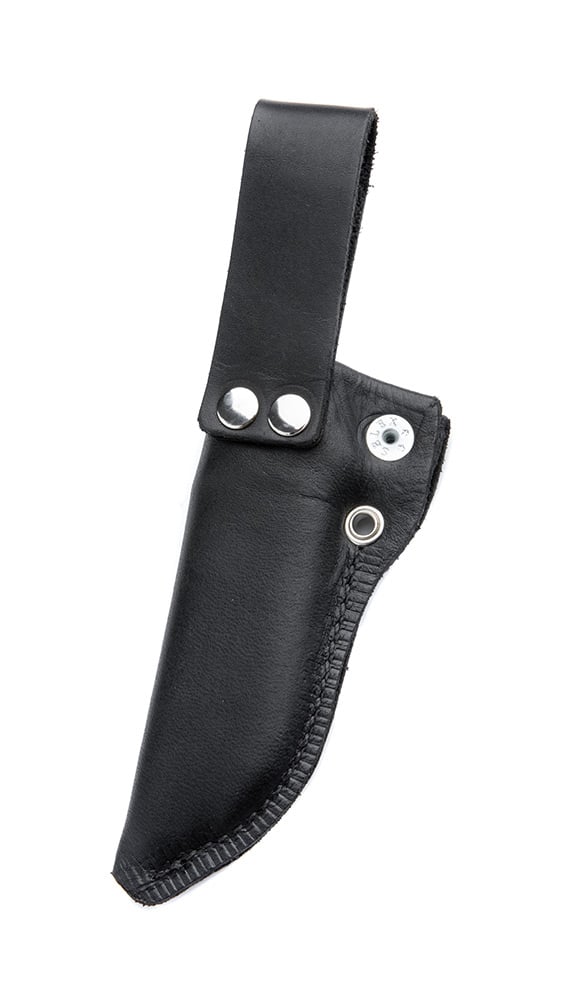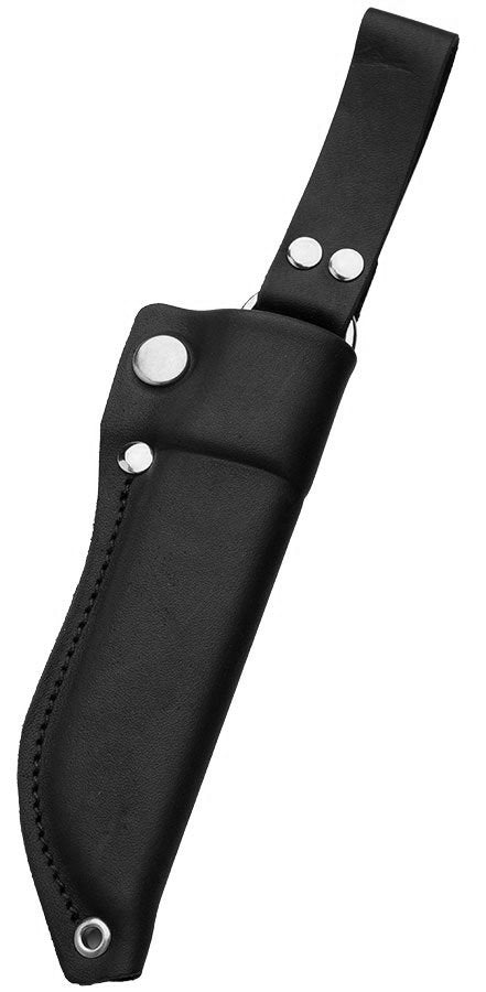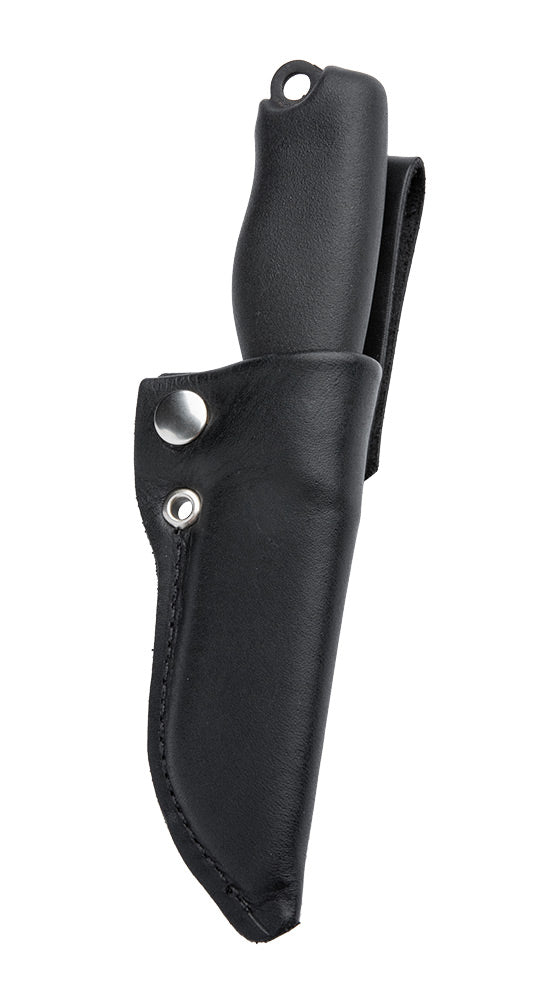 The sturdy dangler leather sheath is built with a roomy plastic liner. The liner is roomy enough for water and crud to run through it and out the hole at the end. Around the mouth of the sheath, the leather is folded double, forming a strong and stiff wide band that is closed tightly around the grip using a press stud. When you pull out the knife, the edge runs nicely between the two leather sides without cutting it, which is a common downside of the traditional "sock" style puukko sheaths. Even without closing the press stud, the sheath retains enough tension to keep the puukko in place, so around camp, you don´t need to be opening and closing the sheath all the time, just remember to snap it shut when you're on the move!