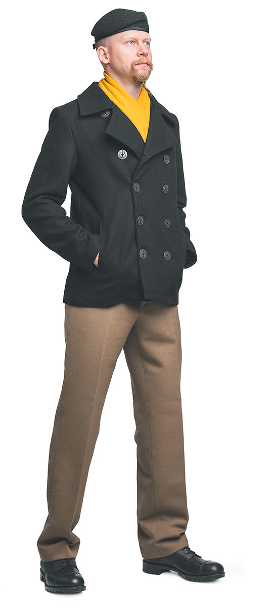 Our own classic woolen pea coat, available in all colors as long as it is black. A simple, stylish, and warm coat, perfect for cold weather both on land and at sea. Protects you from the chilling weather without making you look like a big blob.