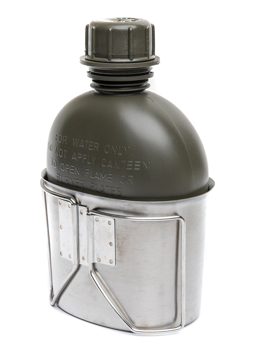This smart cup was invented over a hundred years ago. The cup is designed to be stored together with the canteen, taking up virtually no extra space at all. The style has remained pretty much the same since WWI, although during material shortages these have been made from aluminum. We also have a suitable lid for the cup.