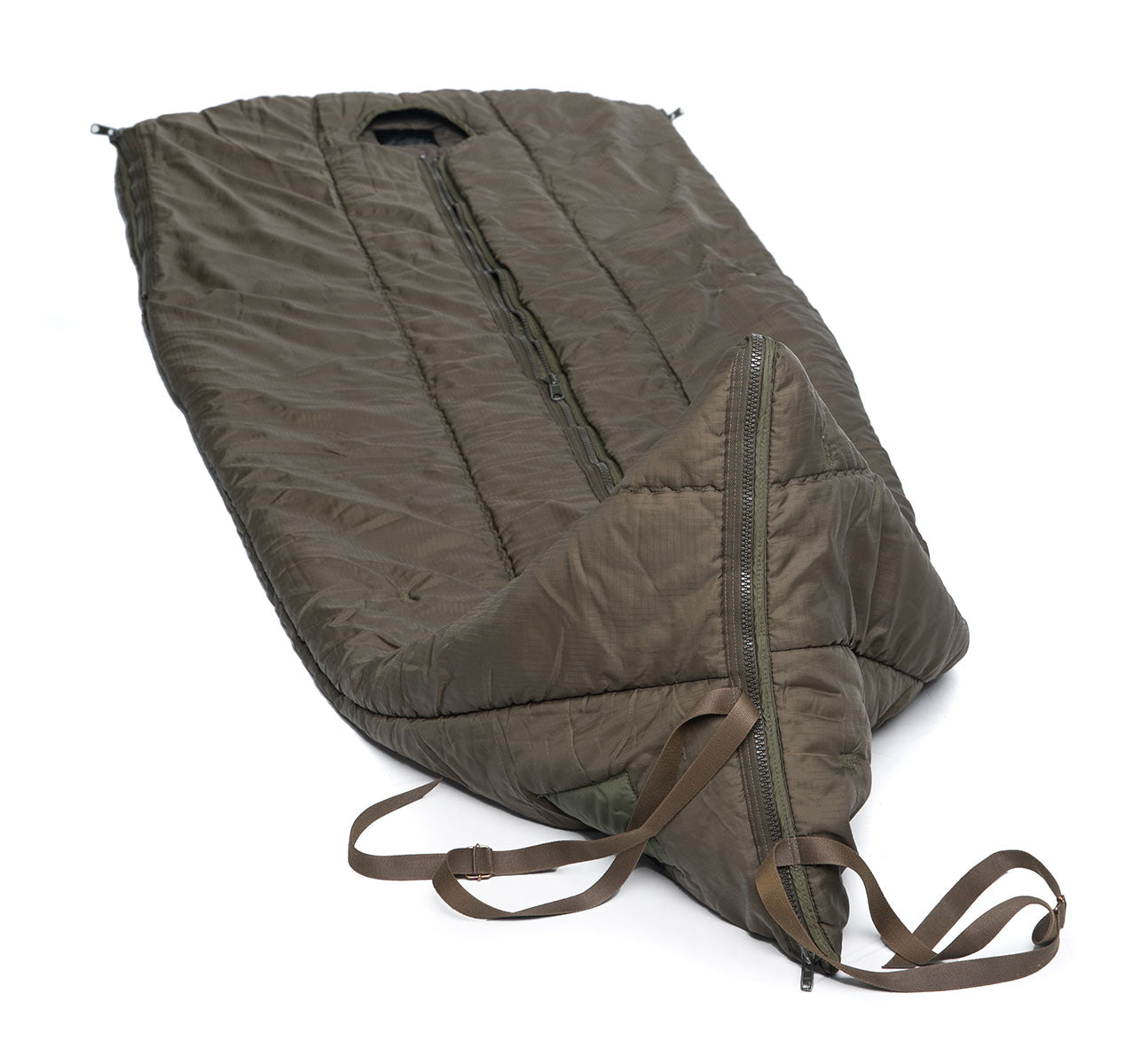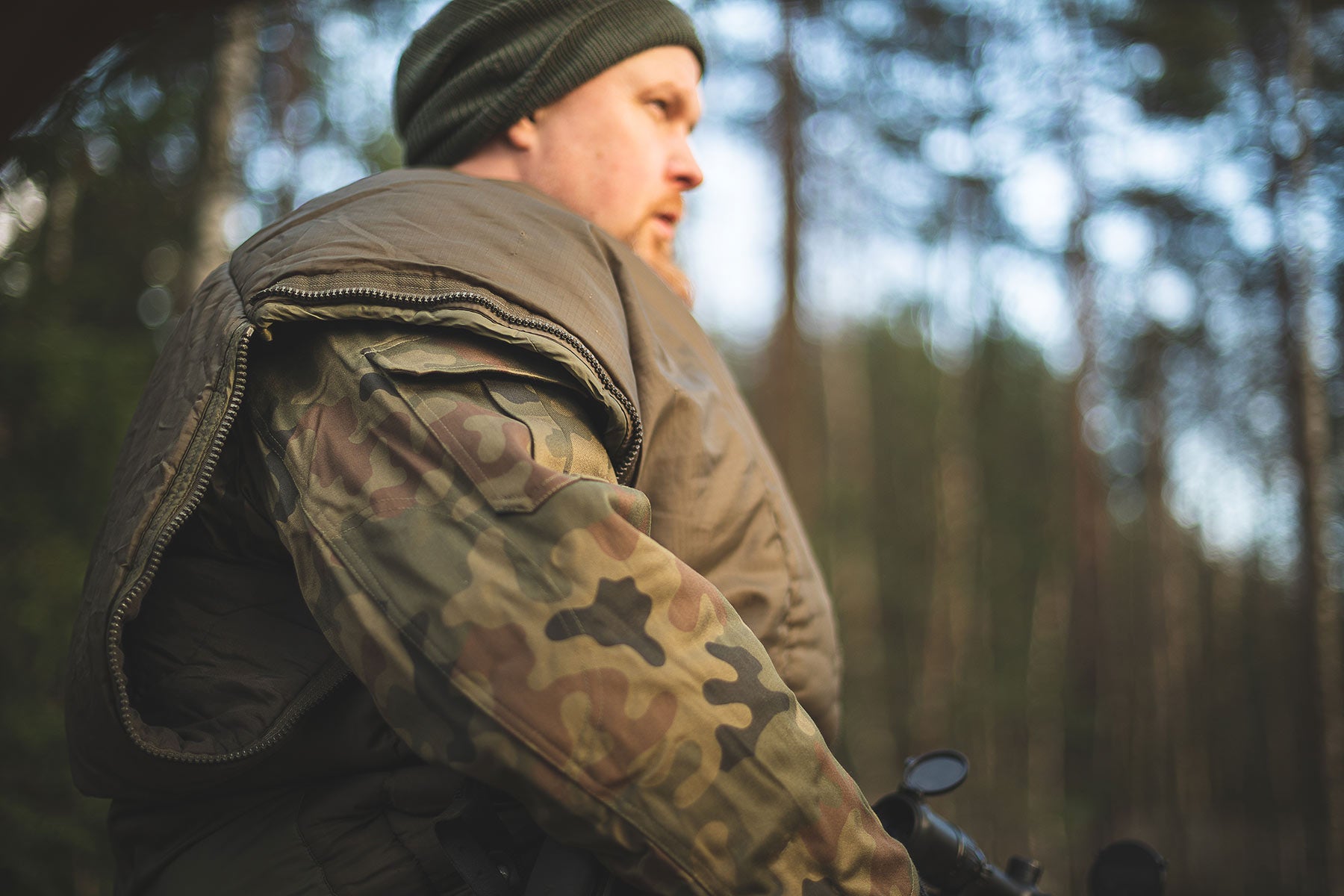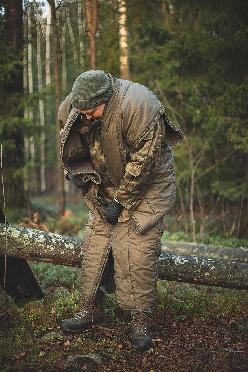 In addition to the regular zipper, these have zippered openings for arms and feet. The ideal use for this poor man’s Jerven is cold weather hunting. Pull this on top of your regular hunting clothes and you can sit still and wait for game no matter how cold it is. You should practice it in advance though so that you can make sure the zippers don't interfere with shooting. If you want to improve usability, sew some sort of loops on the sides so that you can attach the bottom straps to them. This way you can move from one spot to another without tripping on the hem.
