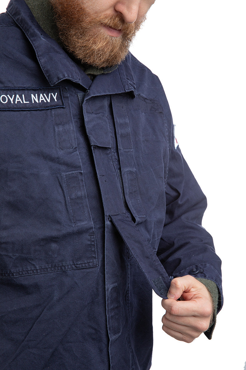 Hello sailor! Here's a lightweight navy blue jacket or a heavyweight shirt, you decide how you want it. In any case, this modern Royal Navy garment is bloody marvelous. Used British military surplus.
