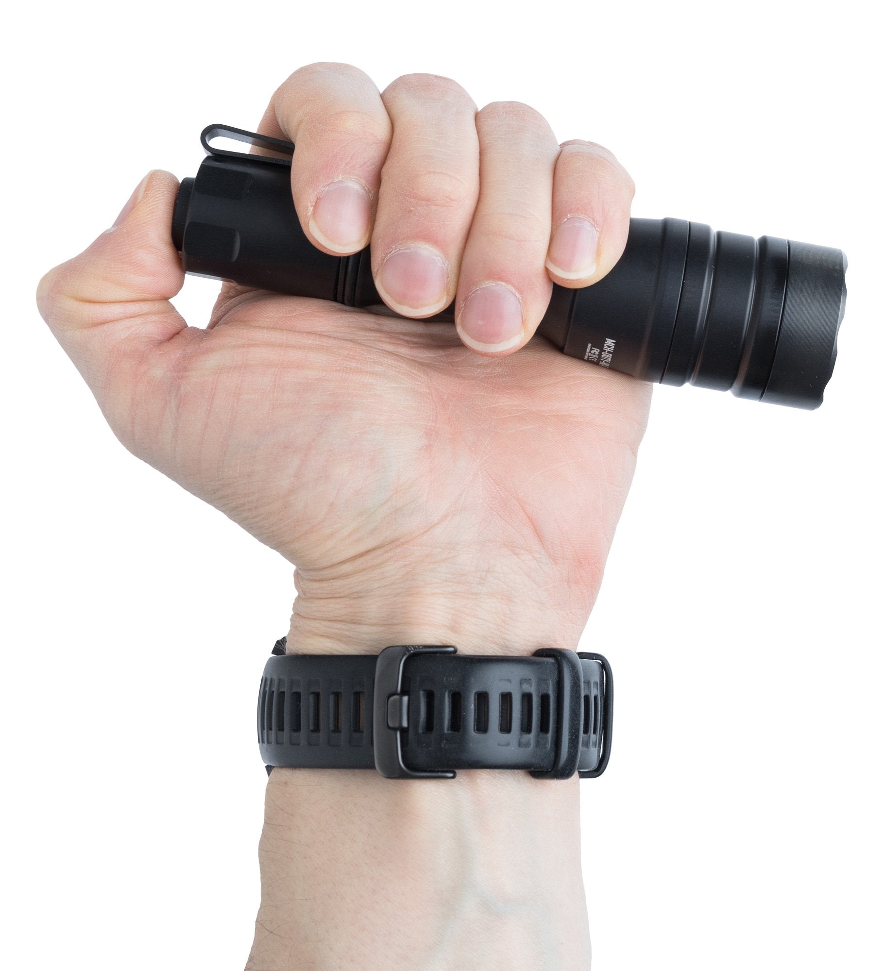 The flashlight comes with three different adjustment rings that can be screwed around the flashlight's operating button. These allow you to customize a button guard tailored to your needs to prevent accidental activation. For example, if you carry the flashlight in your pocket, you might inadvertently press the button and turn on the light. Installing a suitable ring makes such a situation unlikely.