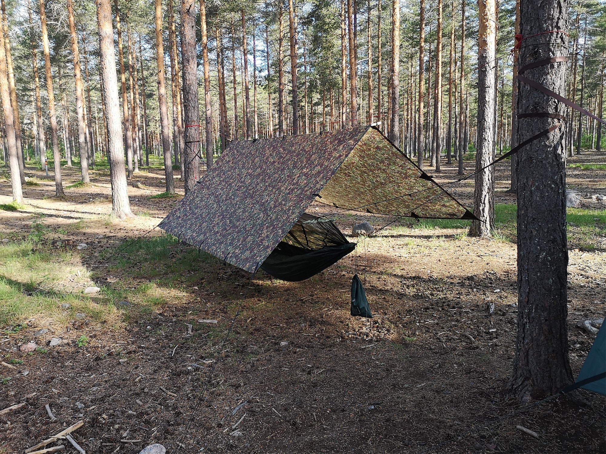 - Works extremely well with hammocks. Pitch it over one and enjoy the rain not pouring on you. Always take a tarp with you when hammock camping.