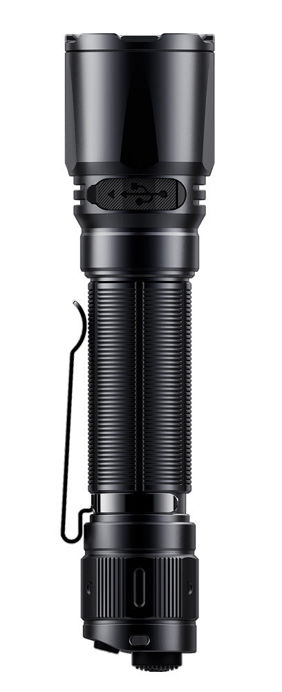 The popular tactical flashlight TK11 is now rechargeable, indicated by the letter R at the end! This is a compact flashlight with tactical features and a brightness of 1600 lumens, suitable for searching for scoundrels or lost individuals. It also works great for civilian purposes, e.g. in the bush, as a work light, and for demanding general use. The flashlight produces a maximum beam distance of 420 meters, is resistant to water, dust, and impacts – and it comes with a rechargeable battery and charging cable. The charging is done directly from the side of the flashlight. The battery does not need to be removed for charging.