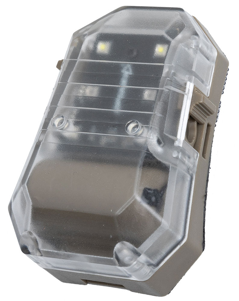 The Opsmen F101 Stealth Survival Light is a multi-function IFF marker that can be mounted on a helmet or other surface with a velcro base. It is mainly used to identify and locate friendlies in law enforcement, military operations, and training such as MFF, maritime, patrol, or search and rescue operations.