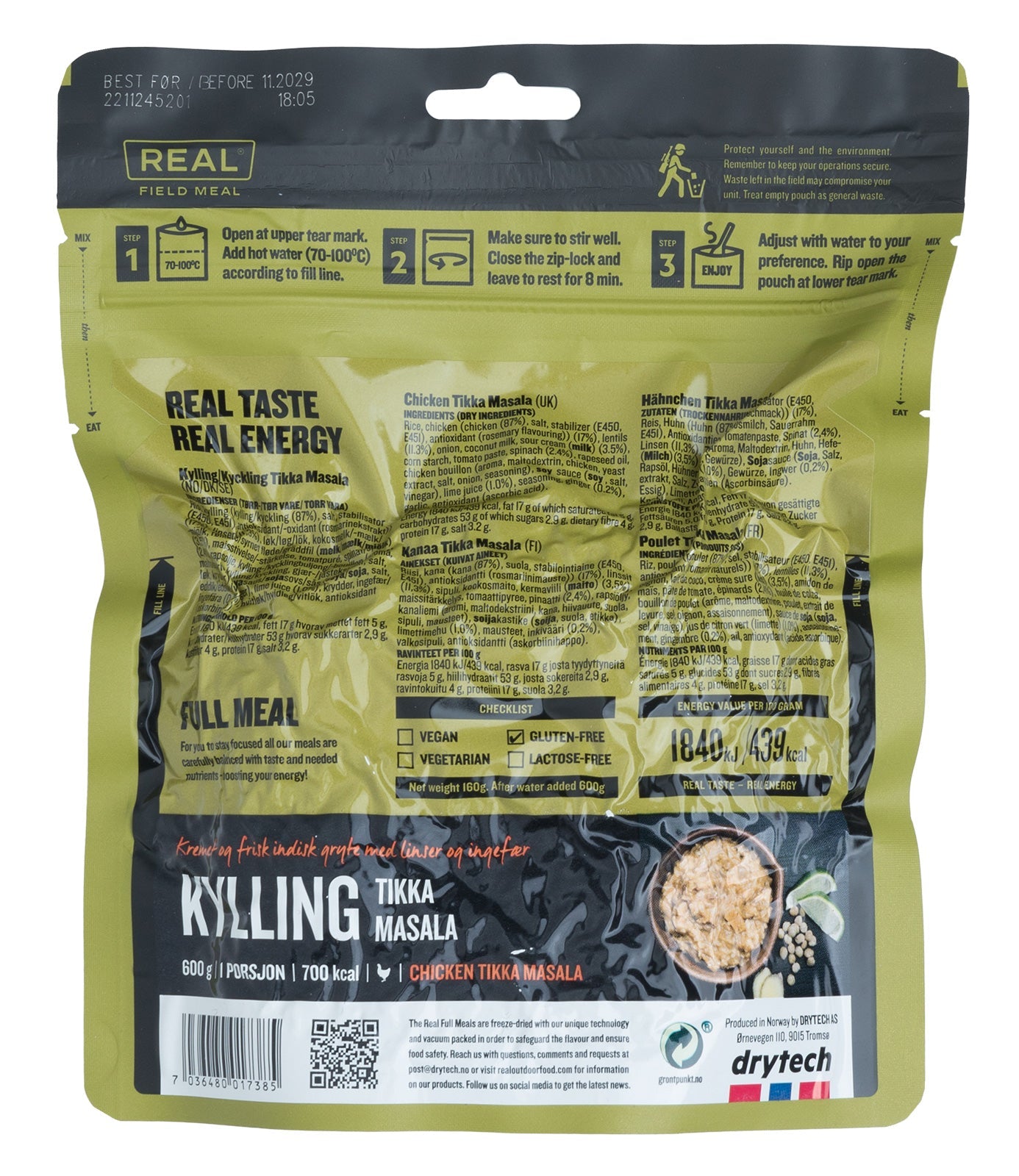 These meals are made by freeze-drying, which is the most gentle way to remove water from food. Freeze-dried products retain their shape and structure relatively unchanged from fresh condition. They also absorb water again better than air-dried products and preserve more of their original taste and aroma. When vacuum-packed, they can last for a very long time, even without the use of preservatives.