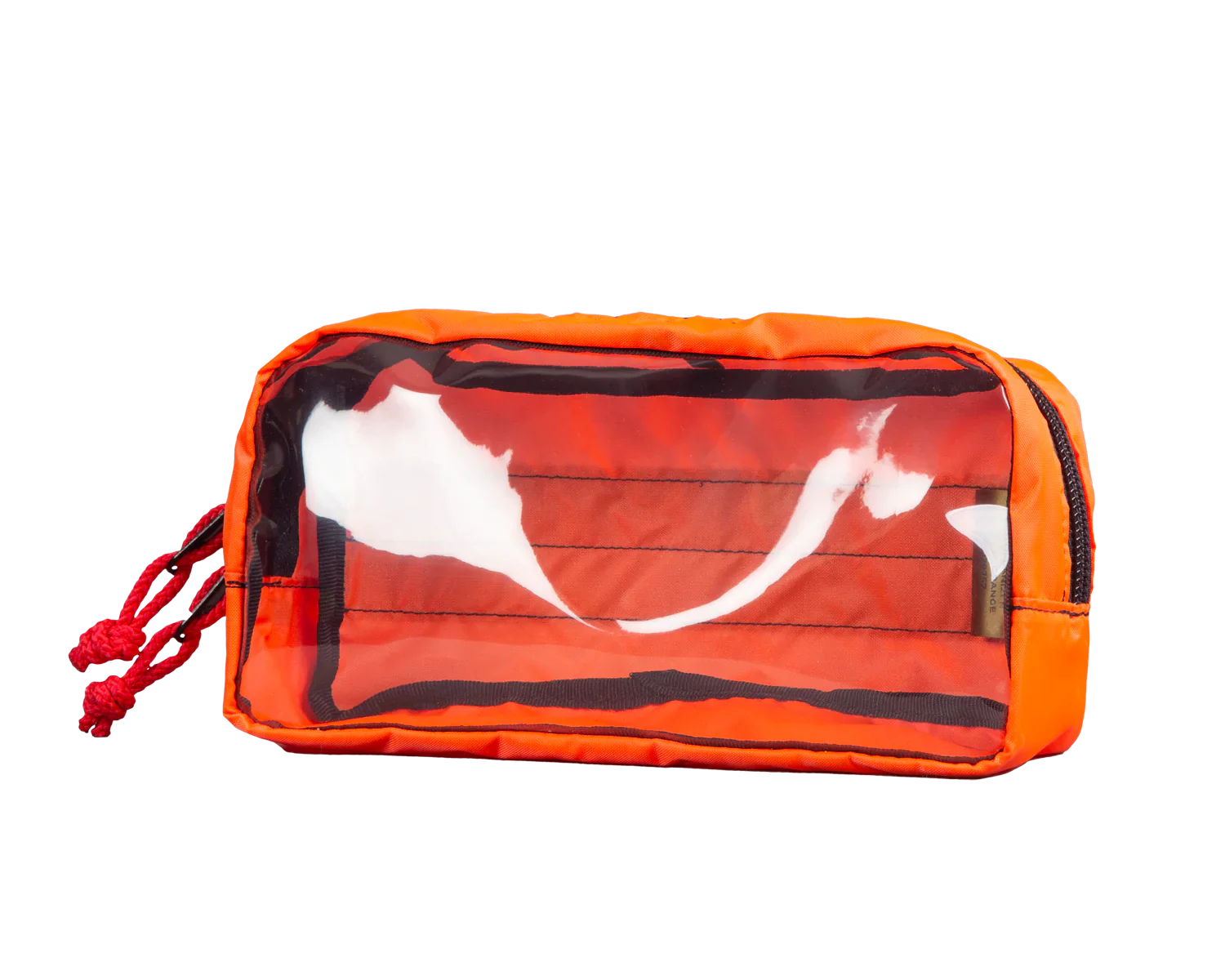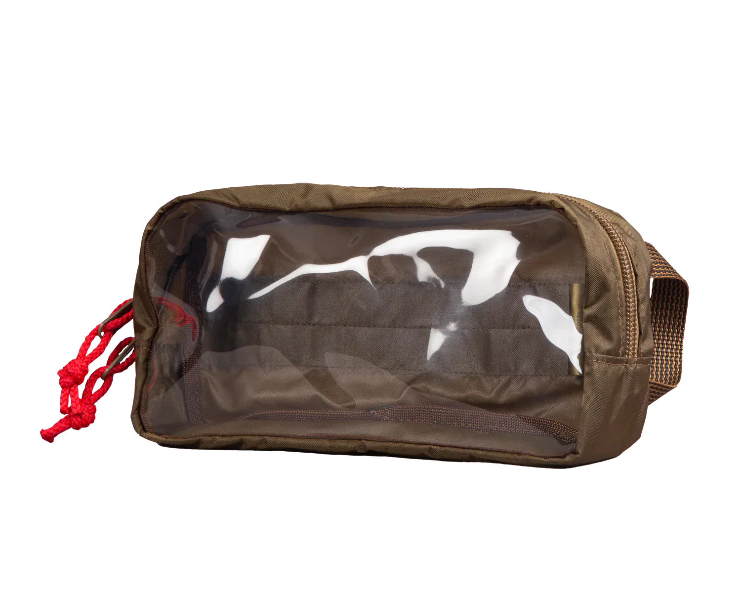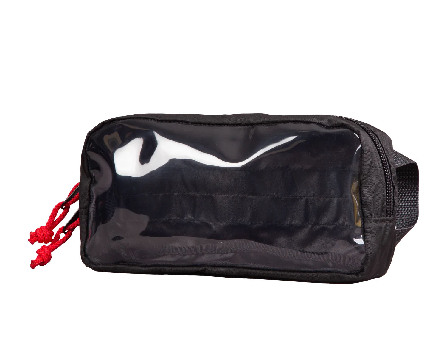 Hook-backed long boxy organizer pouch for medical and whatever stuff. Clear front window, dual-pull zipper with generous silencing/gripping cords. Comes with a loop piece to cover the hook when used in the "standalone" mode.