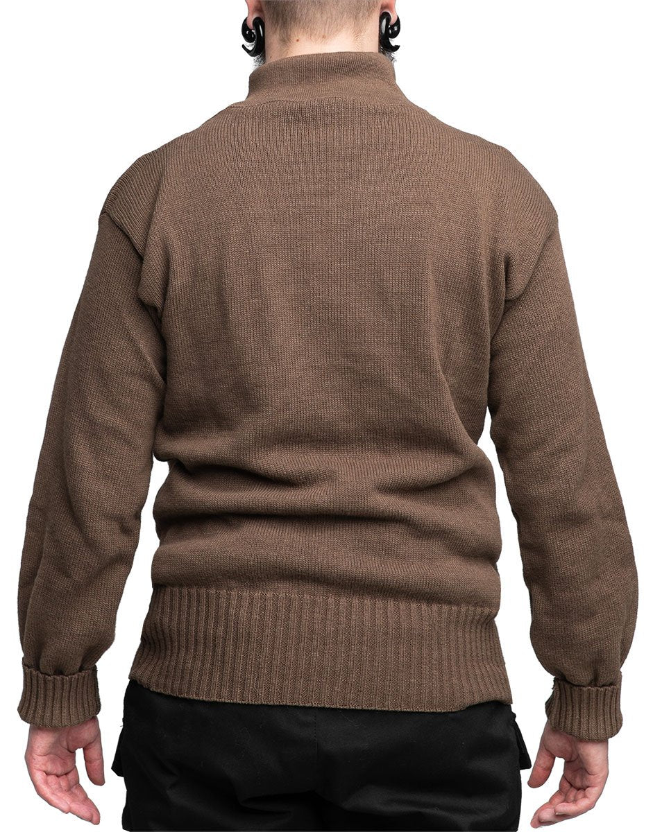 Prior to WWII, soldiers were not equipped with clothes that left a lot of room for improvement. Experiences in the war pushed towards progress and many armed forces discovered layered clothing and one key component of the system: a knit sweater. The US M-1943 High-Neck Sweater was such a success that it remained in use for several decades, being changed only slightly in details such as button size or exact color shade. Speaking of which, these are called OD but appear brown.