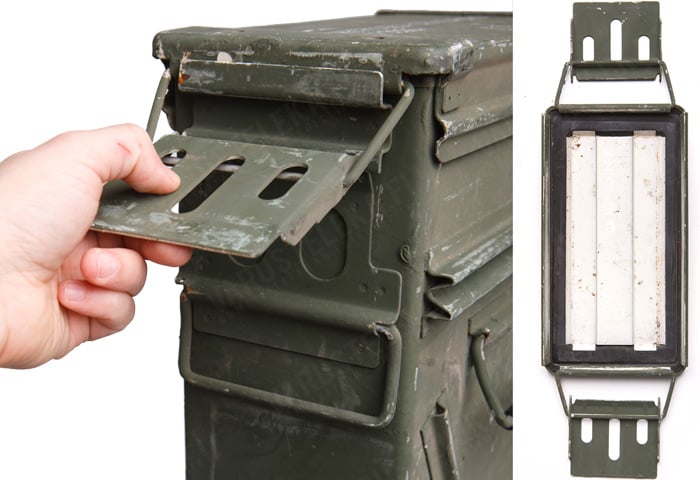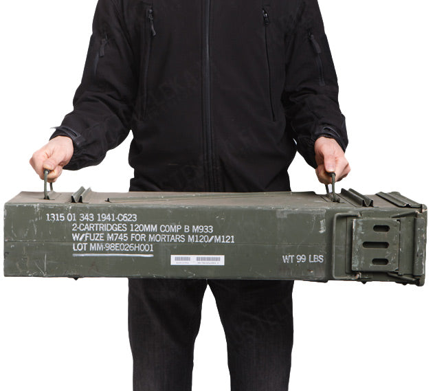 This can is designed for the US 120 mm M120/121 mortar system cartridges. Made of steel painted in olive drab. Originally made to be waterproof but since this is surplus, we cannot guarantee that it still is that.