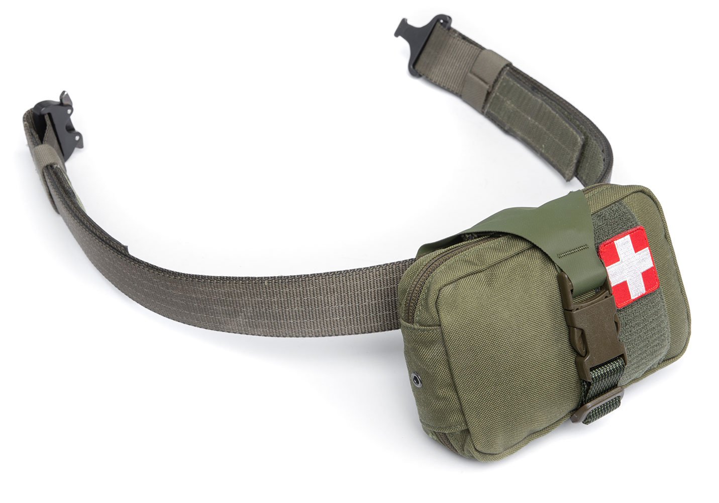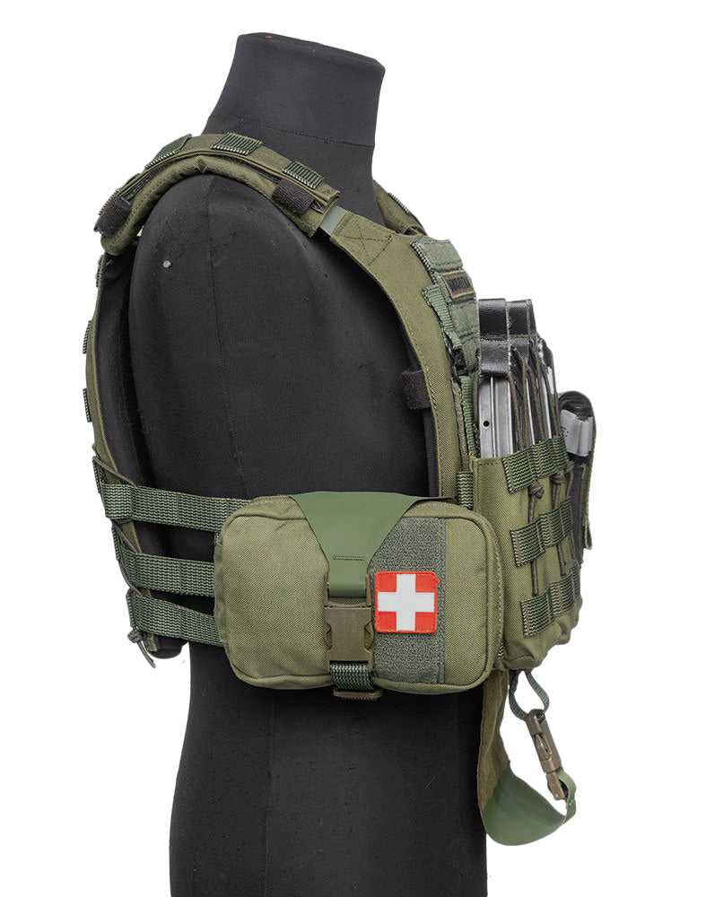 The Hanger mount attaches in between the hook-and-loop of body armor plate bags and similar hook-and-loop "sandwiches" found on chest rigs and other load-carrying gear. This mount keeps the IFAK at your very center and easily accessible with both hands.