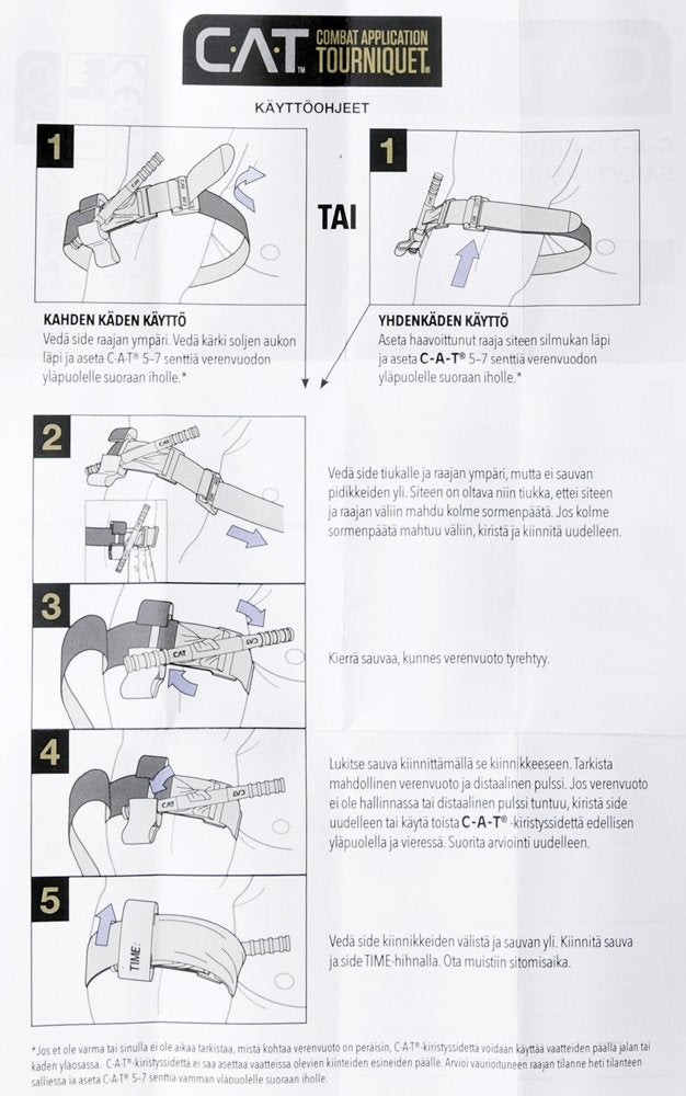 CAT tulee sanoista Combat Application Tourniquet. Kyseessä on yksinkertainen hihnasta ja kierrettävästä kiristystangosta muodostuva helppokäyttöinen kokonaisuus, kuten tämmöisen varusteen täytyy ollakin. Kiristetyn siteen saa luotettavasti varmistettua kiinni potilaskuljetuksen ajaksi tarraremmillä, jossa on myös oma kenttänsä ajan merkkaamiselle.