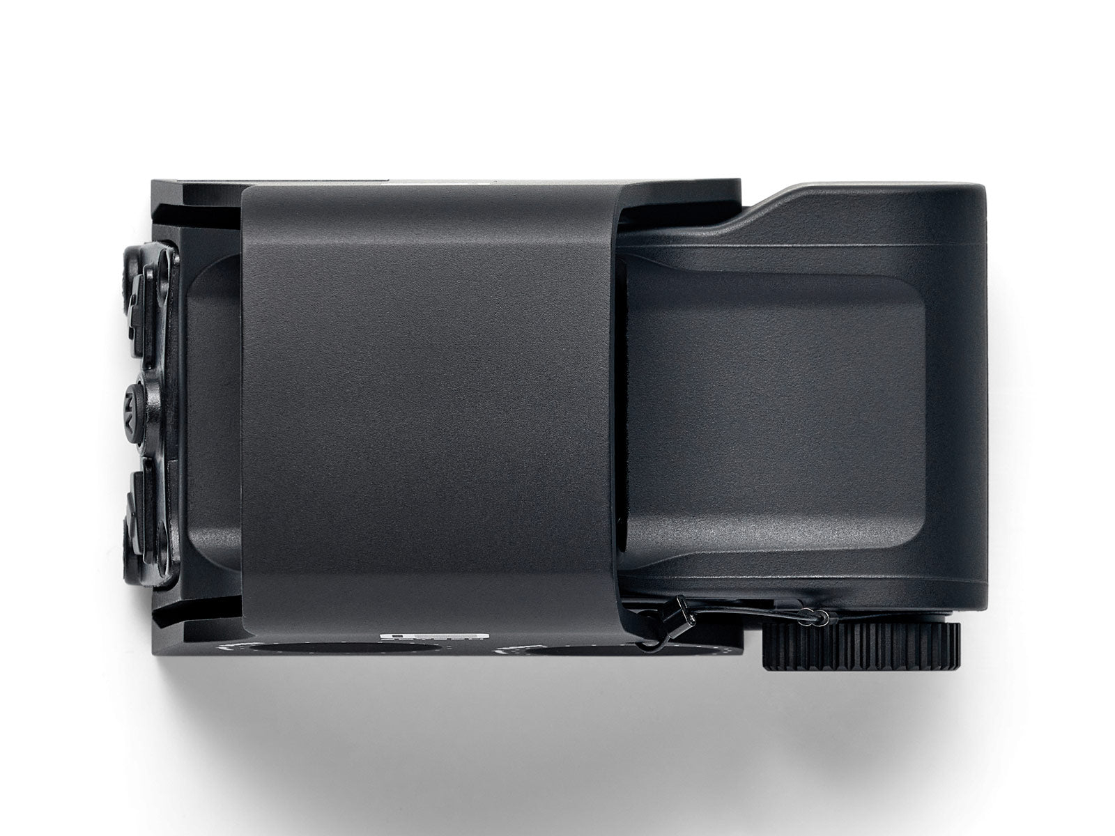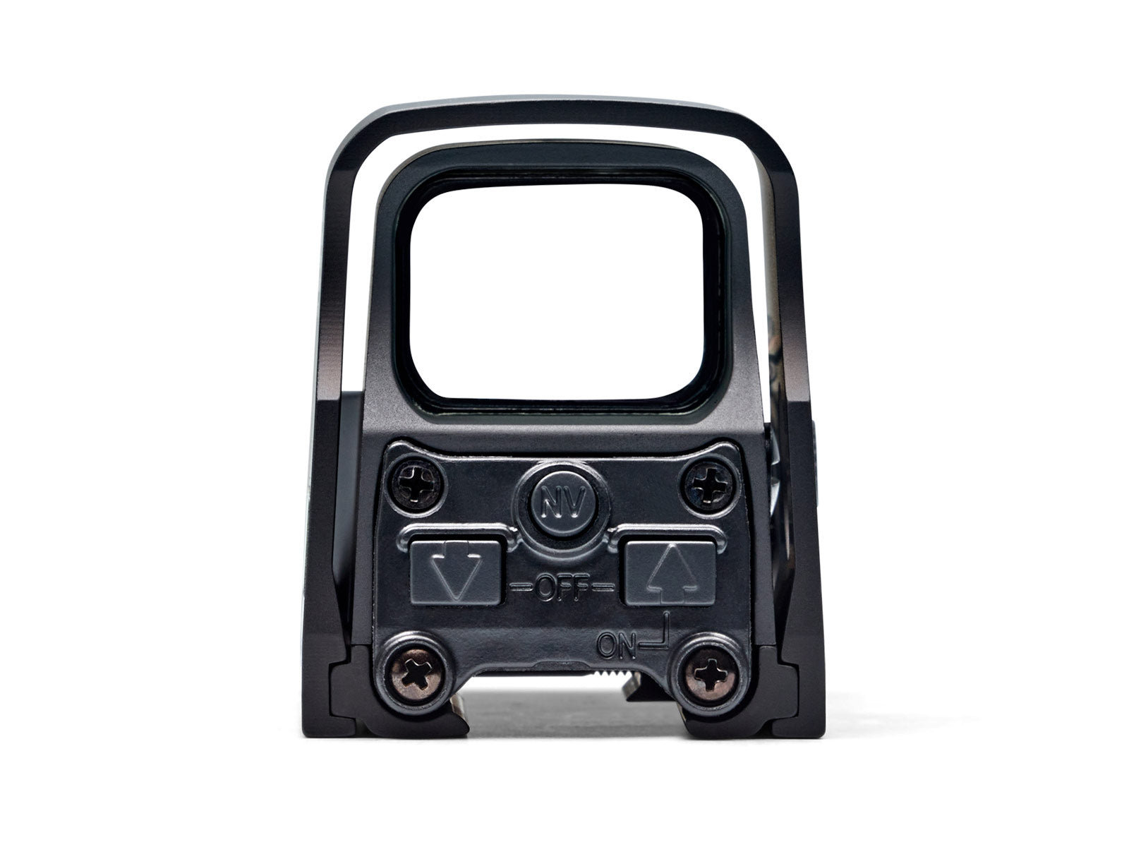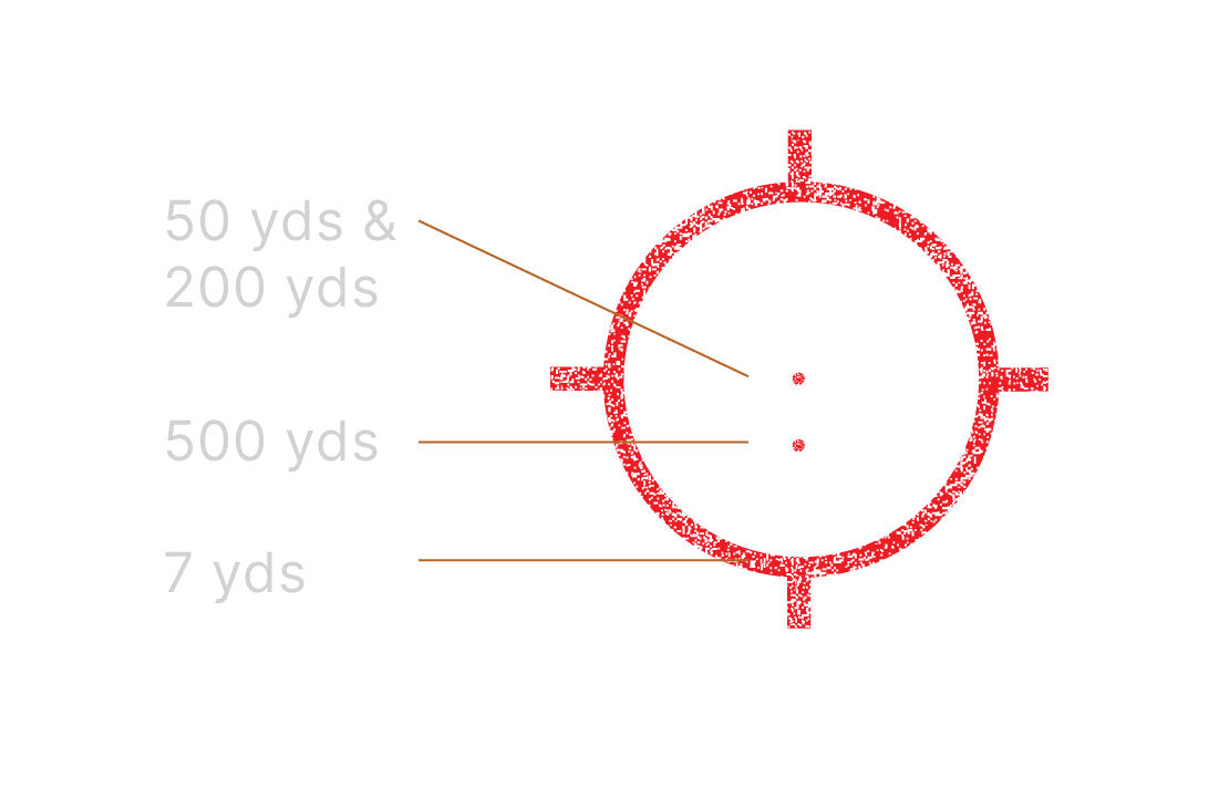 The single transverse-mounted CR123 lithium battery configuration frees rail space, leaving more room for rear iron sights, magnifiers, or a night-vision mount. The two-dot reticle pattern can be easily distinguished with or without magnification and it offers an additional long-range aiming dot.