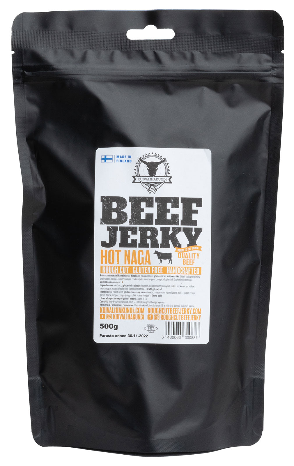 Kuivalihakundin rakkaudella tekemä Beef Jerky on aika pitkälti just mitä me ollaan täällä himoittu: pakkaus on iso, koostumus on just sopivan murea, maku on hämmästyttävän hyvä, ja valmistusmaa on alusta loppuun Suomi - myös lihan alkuperän osalta. Säilyvyys on virallisesti vähän alle vuoden, mutta jos nyt länsimaisten elintarvikelainsäädäntöhössötysten ulkopuolella vähän käydään, niin avaamattomana helposti pitempäänkin. Ei tässä oikeastaan paljoa enempää kerrottavaa ole, hus siitä valkkaamaan makuja.