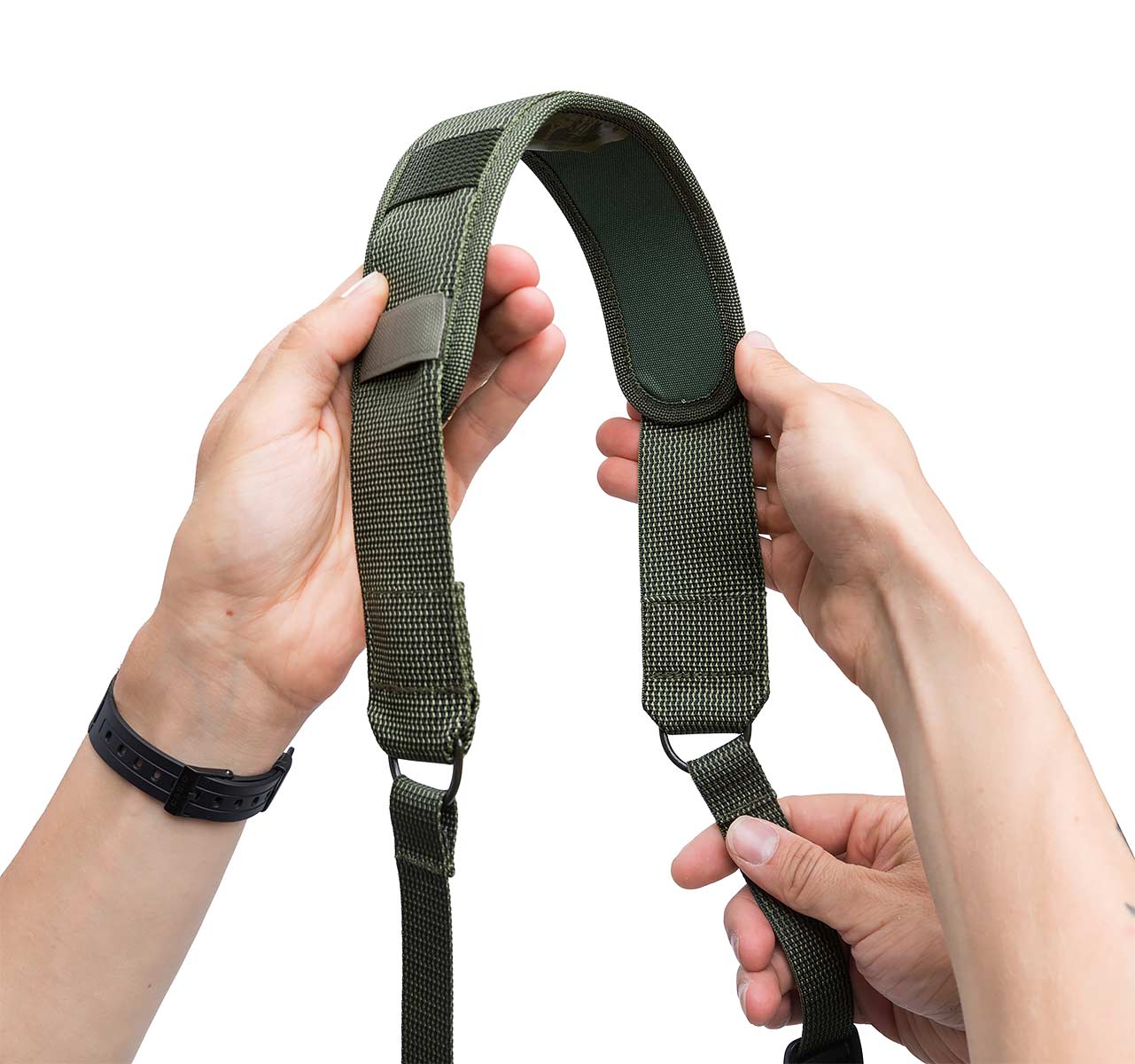 Teräksisiin D-renkaisiin ommellut päät kiinnitetään Tri-Glide-soljilla mihin haluat. Hihnan pituus on siis portaattomasti säädettävissä ja sen saa kiinni käytännössä ihan mihin vain.