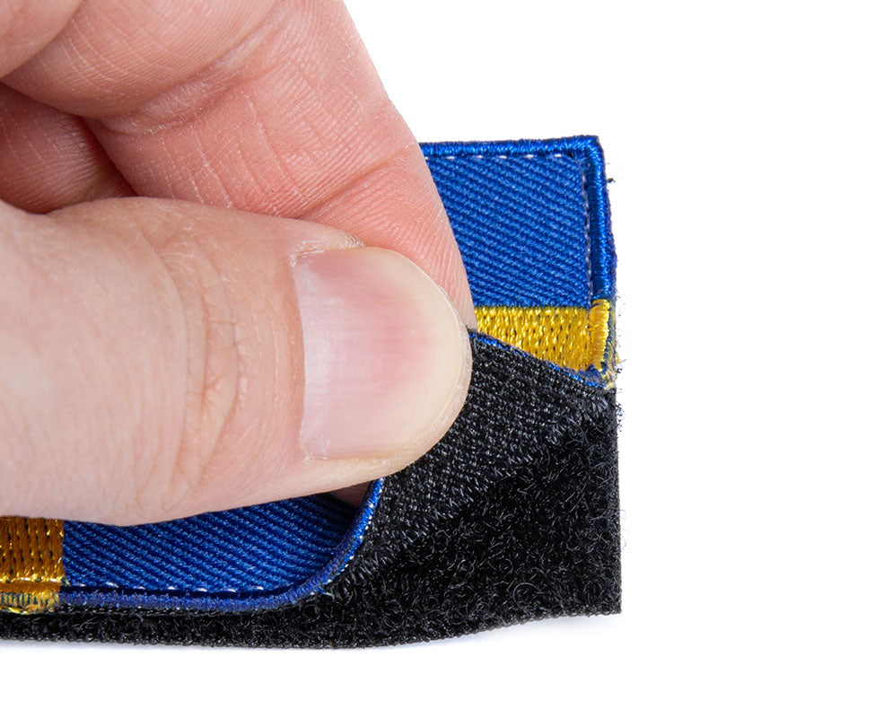 Hihaan tai muualla olevaan tarrapohjaan kiinnittyvä Ruotsin lippu.