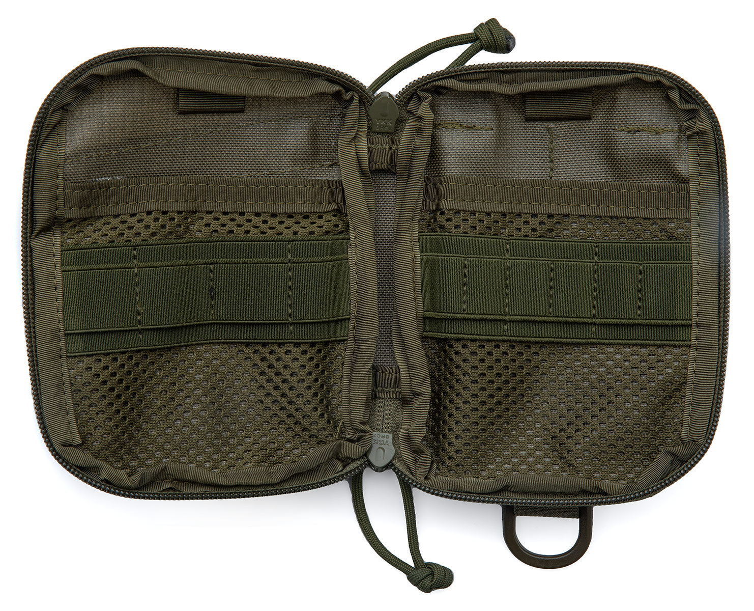 PALS loops, loop base, and elastics on the front panel. Mesh pockets, wide and narrow elastics on the inside.